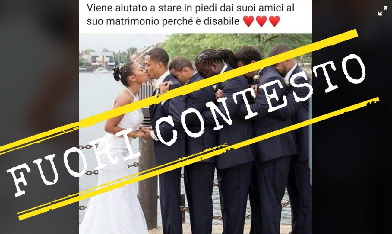 Il 12 settembre su Facebook è stata pubblicata una fotografia che mostra uno sposo baciare la sposa, mentre alle sue spalle sembra essere sorretto da una fila di persone. Lo scatto è accompagnato da questo commento: «Viene aiutato a stare in piedi dai suoi amici al suo matrimonio perché disabile».