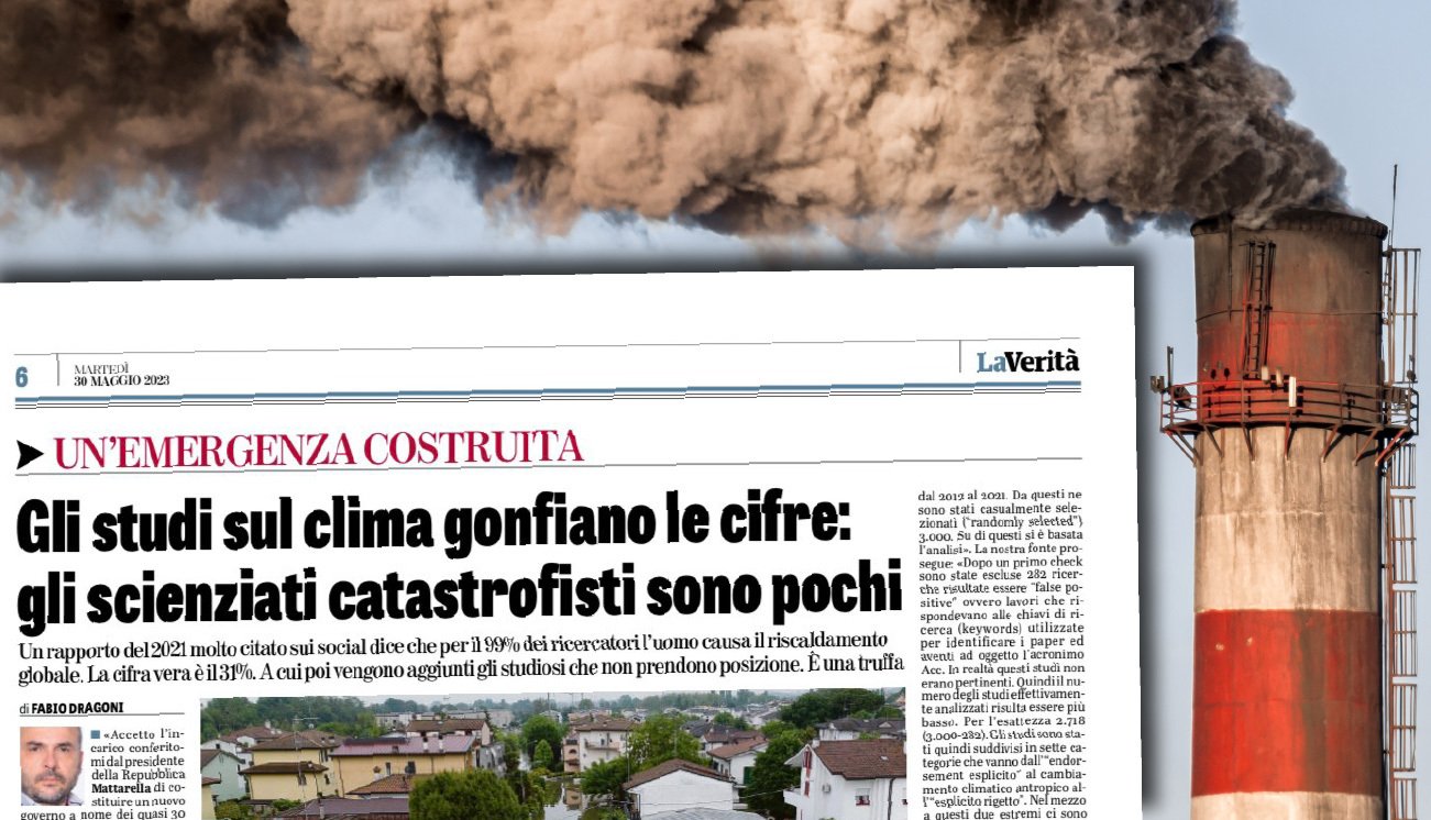 Negli scorsi giorni questo ampio consenso è stato messo in dubbio da La Verità in alcuni articoli. Per esempio il 26 maggio 2023 il quotidiano ha pubblicato un articolo firmato da Franco Battaglia, docente di chimica fisica all’Università di Modena e Reggio Emilia. Tre giorni dopo l’articolo è stato rilanciato dal giornalista Fabio Dragoni in un tweet, che un lettore ha chiesto a Facta.news di verificare. Nel tweet il giornalista de La Verità ha scritto che è una «CAZZATA» la «favoletta» secondo cui il 97 per cento degli scienziati sostengono che i cambiamenti climatici hanno un’origine antropica, ossia sono causati dagli esseri umani. Secondo Dragoni e Battaglia, solo una minoranza degli scienziati crede nell’origine antropica dei cambiamenti climatici, ma le conclusioni di entrambi sono infondate, smentibili analizzando vari studi scientifici sul tema.