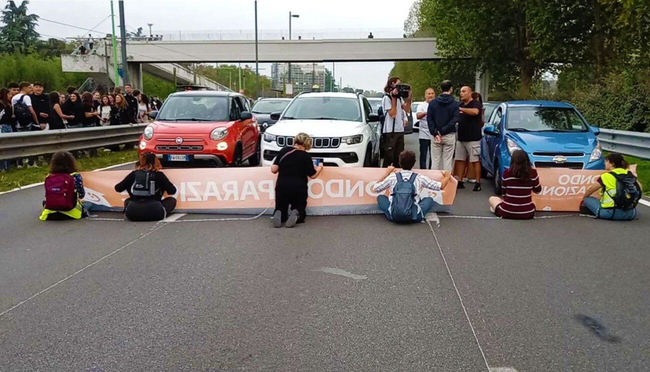 Nella mattinata del 20 settembre, alcune attiviste del movimento ambientalista Ultima Generazione hanno bloccato il traffico in viale Fulvio Testi a Milano, direzione centro città. Sei militanti si sono sedute in mezzo alla carreggiata, legandosi tra loro con una catena e tenendo in mano uno striscione che recitava: «Fondo Riparazione». La protesta si inserisce in una serie di azioni simili avvenute in altre città d’Italia che mirano a chiedere allo Stato italiano un fondo da 20 miliardi di euro «per riparare i danni subiti dai cittadini a causa degli eventi meteorologici estremi (alluvioni, grandinate, incendi, siccità e così via) dovuti allo stravolgimento climatico provocato dall’uso dei combustibili fossili».