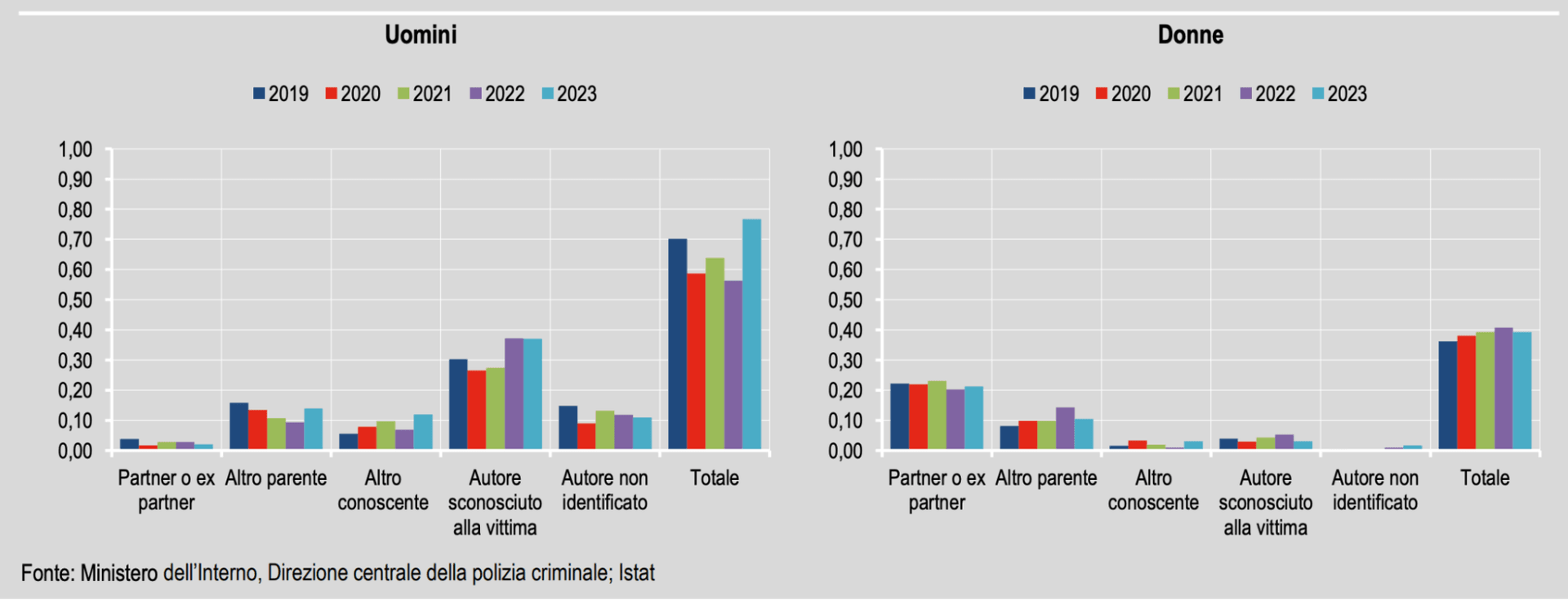 Nel 2023 gli uomini uccisi da partner o ex partner sono stati 6 su 217, tutti uccisi da donne. Sono 40 gli uomini uccisi dai parenti, 37 dei quali sono stati assassinati da altri uomini.