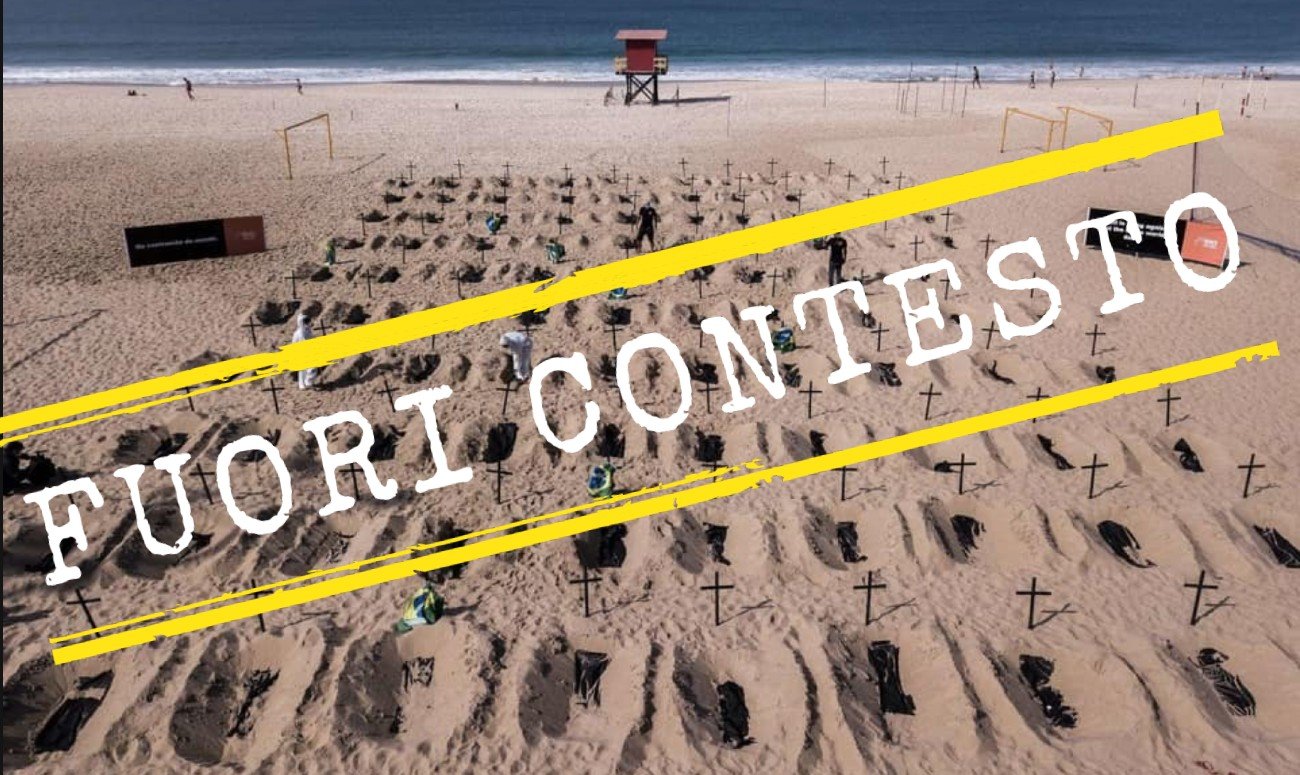 Il 13 giugno su Facebook è stata pubblicata una foto che mostra decine di croci posizionate verticalmente nella sabbia su una spiaggia, in prossimità del mare. La foto è accompagnata da questo commento: «Spiaggia di Copacabana Brasile… 100 tombe anche in spiaggia… Ahimè..». Il riferimento è all’aumento di contagi e vittime legate alla pandemia da Covid-19 in atto in Brasile.