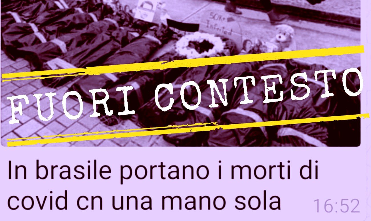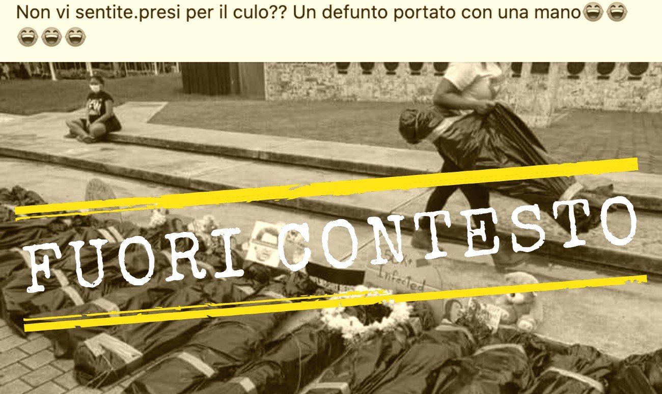 Il 2 luglio su Facebook è stata pubblicata una foto che mostra una serie di sacchi neri in fila che, complice il testo che accompagna l’immagine, sembrano contenere persone decedute. Lo scatto mostra anche due figure: sulla sinistra una seduta per terra su uno scalino e sulla destra una in piedi che trasporta uno dei sacchi. La foto è accompagnata da questo commento: «In brasile portano i morti di covid cn una mano sola».