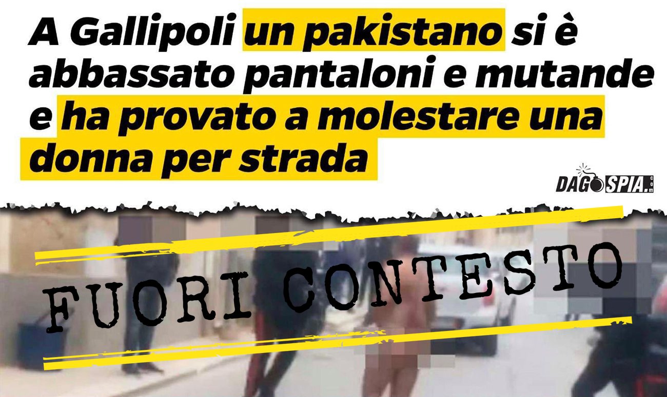 La notizia della tentata molestia di un uomo pakistano nei confronti di una donna a Gallipoli è confermata da una fonte stampa locale, che l’8 luglio 2020 parlava di «un 35enne pakistano fermato dai Carabinieri e sottoposto a un Tso da parte dei sanitari del 118». Secondo la ricostruzione di Leccesette, l’uomo, in possesso di un permesso di soggiorno, è stato sorpreso a camminare nudo per strada ed è stato fermato dopo la segnalazione di alcuni passanti, allertati dalle urla di una donna.