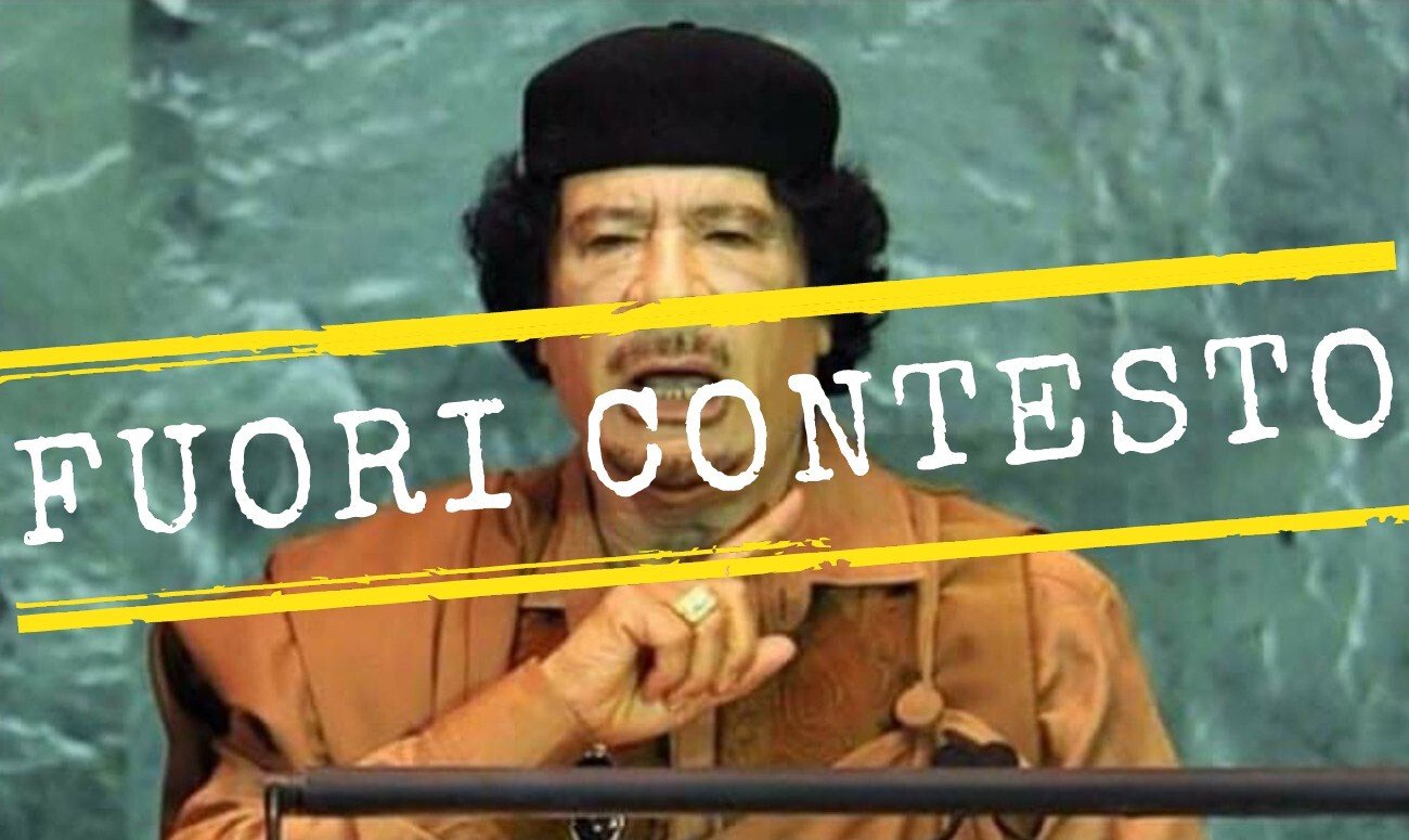 Il 28 ottobre 2020 su Facebook è stata pubblicata una foto di Muammar Gheddafi, politico e militare libico ucciso nel 2011 al termine di un conflitto civile in Libia, accompagnata da una sua presunta dichiarazione che avrebbe rilasciato alla 64esima edizione dell’Assemblea Generale delle Nazioni Unite svoltasi a New York (Usa) nel 2009. Gheddafi avrebbe detto: «Creeranno virus da soli e ti venderanno antidoti e poi faranno finta di aver bisogno di tempo per trovare una soluzione quando già ce l’hanno». La presunta dichiarazione del capo libico è accompagnata da questo commento, scritto da chi ha pubblicato il post su Facebook: «Cosa intendeva comunicarci con quel discorso? Due anni dopo fu fatto fuori in una guerra di invasione militare nella sua Libia».