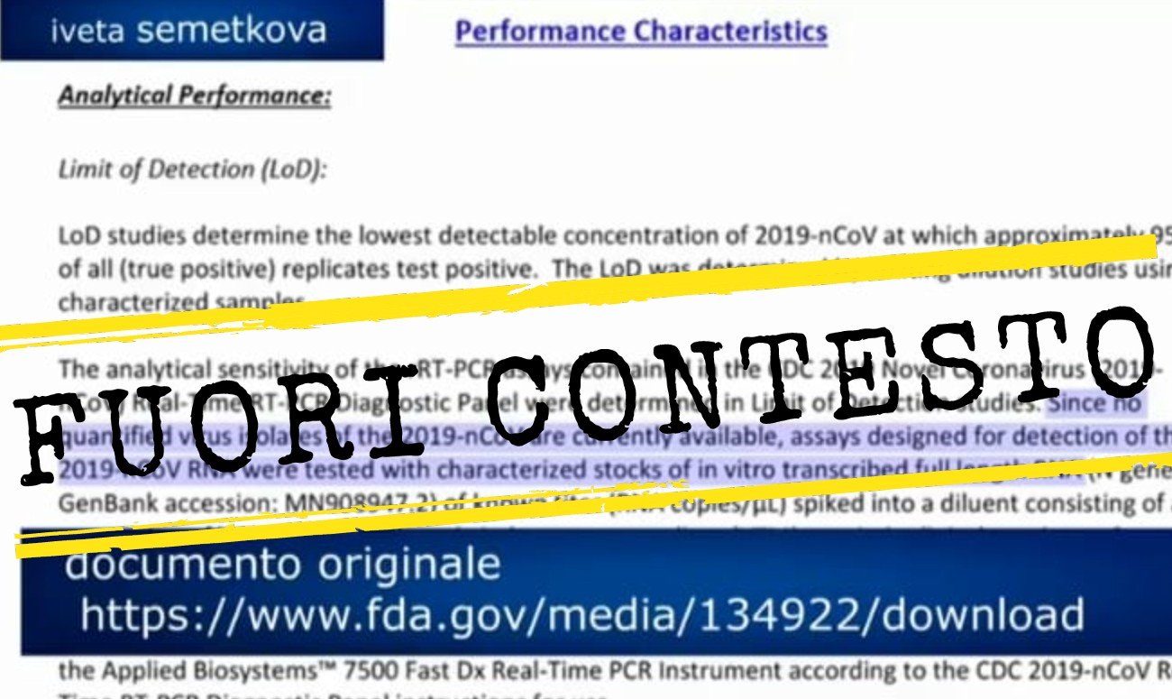 Nell’immagine oggetto della nostra verifica, si sottolinea un passaggio del documento che dice: «Poiché al momento non sono disponibili isolati del virus 2019-nCoV quantificati, i test progettati per il rilevamento dell’Rna di 2019-nCoV sono stati testati con stock caratterizzati di Rna a lunghezza intera trascritto in vitro».