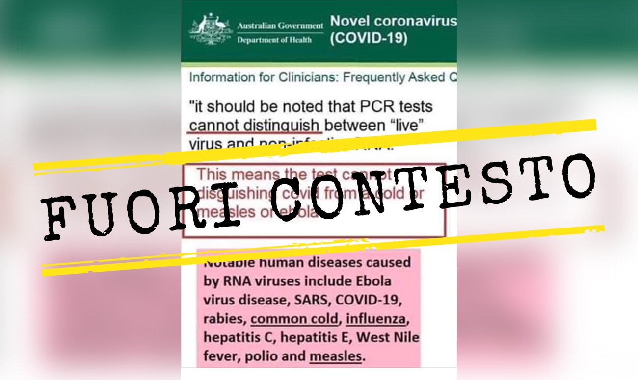 L’immagine oggetto della nostra verifica è composta dal logo del governo australiano e da un presunto testo redatto dal ministero della Salute australiana che recita: «It should be noted that PCR tests cannot distinguish between ‘live’ virus and non-infective RNA. This means the test cannot distinguish covid from a cold or measles or ebola», ovvero «Bisogna specificare che i test molecolari non sono in grado di distinguere tra virus “vivo” e RNA non infettivo» e ancora «ciò significa che il test molecolare non è in grado di distinguere la Covid da un raffreddore, dal morbillo o dall’ebola».