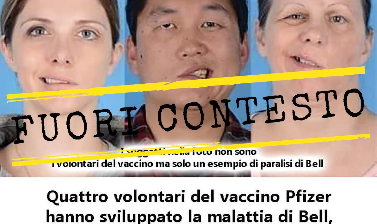 Il 14 dicembre 2020 la redazione di Facta ha ricevuto la segnalazione di un’immagine pubblicata l’11 dicembre sulla pagina Facebook Il Grande Inganno DUE. L’immagine è divisa in due parti: la metà superiore mostra tre persone (due donne e un uomo) apparentemente affette da una paresi di metà del volto, con sovrapposta la didascalia «I soggetti nella foto non sono i volontari del vaccino ma solo un esempio di paralisi di Bell». La parte inferiore dell’immagine riporta il seguente testo: «Quattro volontari del vaccino Pfizer hanno sviluppato la malattia di Bell, Una malattia neurologica molto grave e irreversibile che determina paralisi facciale e l’incapacità di controllare i muscoli del viso dal lato colpito.. Non hanno bisogno del patentino vaccinale, glielo hanno stampato in faccia».