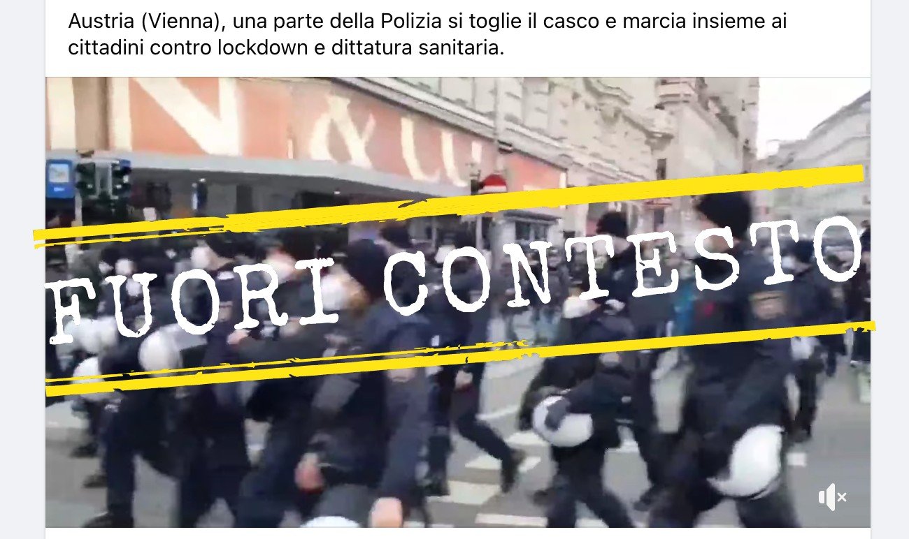 Il 31 gennaio 2021 su Facebook è stato pubblicato un video che mostra un corteo di persone lungo una strada. All’inizio del corteo si vedono diversi agenti di polizia, senza il casco e con una mascherina indossata sul volto. A seguire, cittadini comuni che sfilano. Le immagini sono accompagnate da questo commento, scritto da chi ha pubblicato il video su Facebook: «Austria (Vienna), una parte della Polizia si toglie il casco e marcia insieme ai cittadini contro lockdown e dittatura sanitaria».