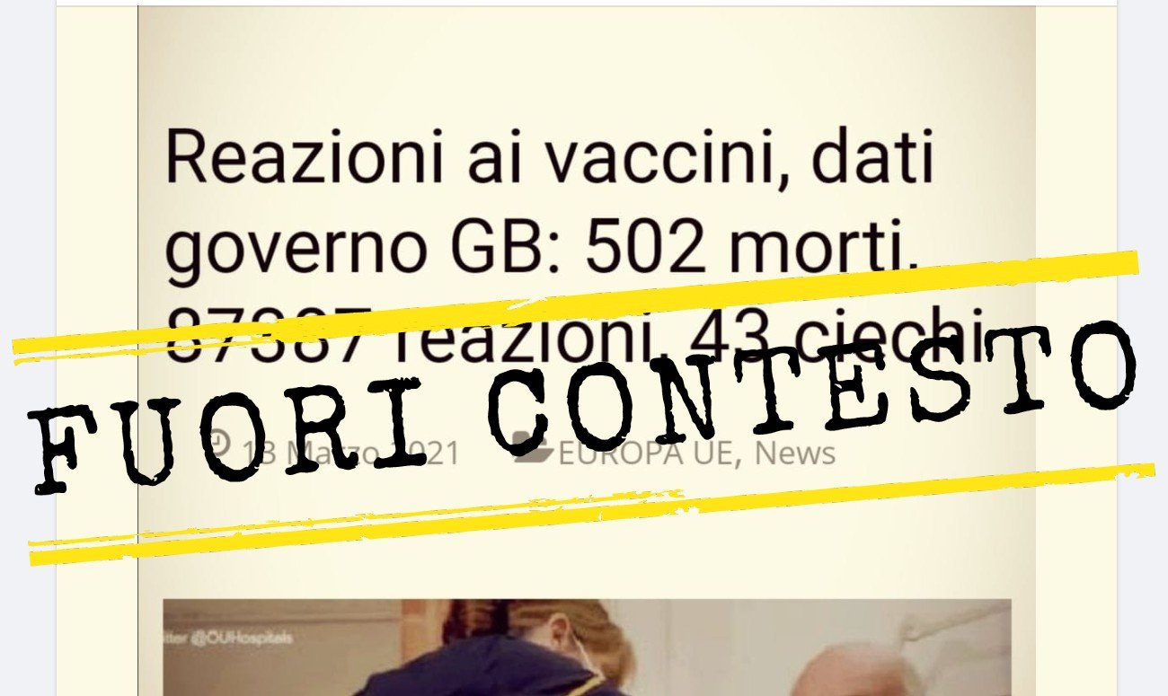 Lunedì 15 marzo 2021 su Facebook è stata pubblicata un’immagine che riporta questo testo: «Reazione ai vaccini, dati governo GB: 502 morti, 87387 reazioni, 43 ciechi». L’immagine è accompagnata da un testo, pubblicato da chi ha pubblicato il post su Facebook: «Reazioni al vaccino. I numeri nel Regno Unito. Questi i dati resi pubblici dal governo inglese sulle reazioni ai vaccini Pfizer e AstraZeneca. Data di esecuzione: 9 marzo 2021. Al 28 febbraio 2021, per il Regno Unito, sono stati segnalati 33207 cartellini gialli per Pfizer/BioNTech, 54180 per il vaccino dell’Università di Oxford/AstraZeneca e 251 per i casi in cui la marca del vaccino non era specificata. In sintesi per tutti e due i vaccini abbiamo 502 morti, 87387 reazioni, 43 cecità totale».