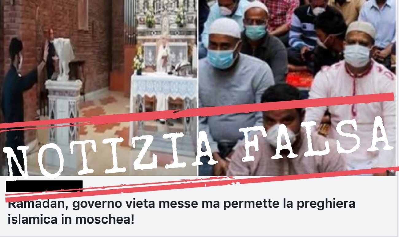 Venerdì 8 maggio la redazione di Facta ha ricevuto via WhatsApp una segnalazione che chiedeva di verificare una notizia, circolata su Facebook, dal titolo «Ramadan, il governo vieta le messe ma permette la preghiera islamica in moschea».