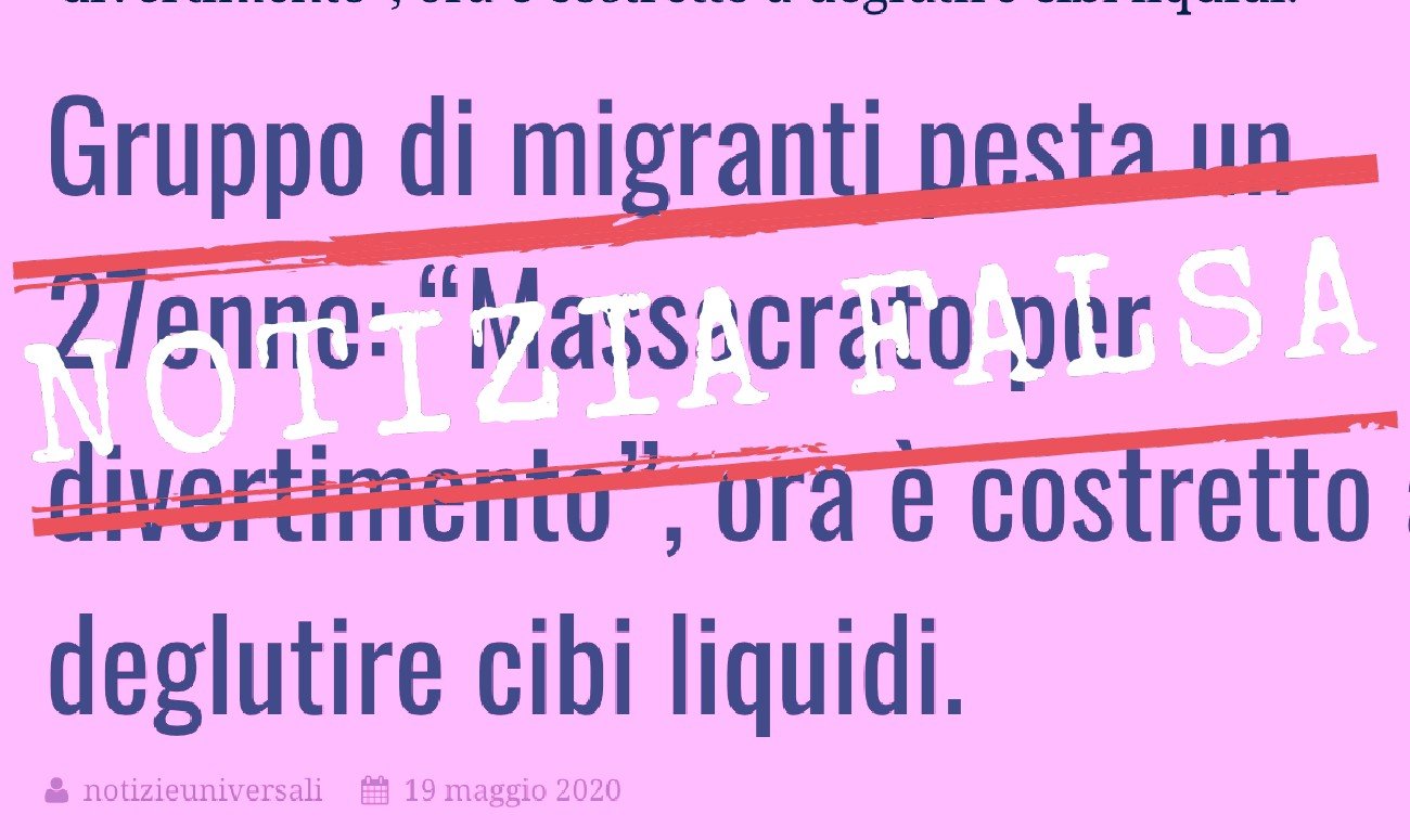 Il 19 maggio il sito Notizie Universali ha pubblicato un articolo dal titolo «Gruppo di migranti pesta un 27enne: “Massacrato per divertimento”, ora è costretto a deglutire cibi liquidi.». Nel testo si legge che una donna di Taranto (Puglia) su Facebook avrebbe scritto in un post che il marito sarebbe stato aggredito mentre tornava a casa dal lavoro da un gruppo di immigrati «per puro divertimento».