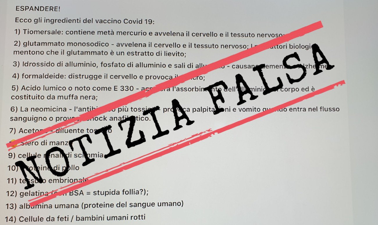 Il 20 giugno su Facebook è stata pubblicata un’immagine che mostra un testo in cui vengono elencati una serie di presunti «ingredienti del vaccino Covid-19». Tra di essi compaiono: «acetone – diluente tossico», «siero di manzo», «cellule renali di scimmia», «gelatina». L’immagine è accompagnata da questo commento, scritto da parte dell’utente che ha pubblicato l’immagine: «Ma vi prego prima di fare il vaccino leggete qua!!!!».