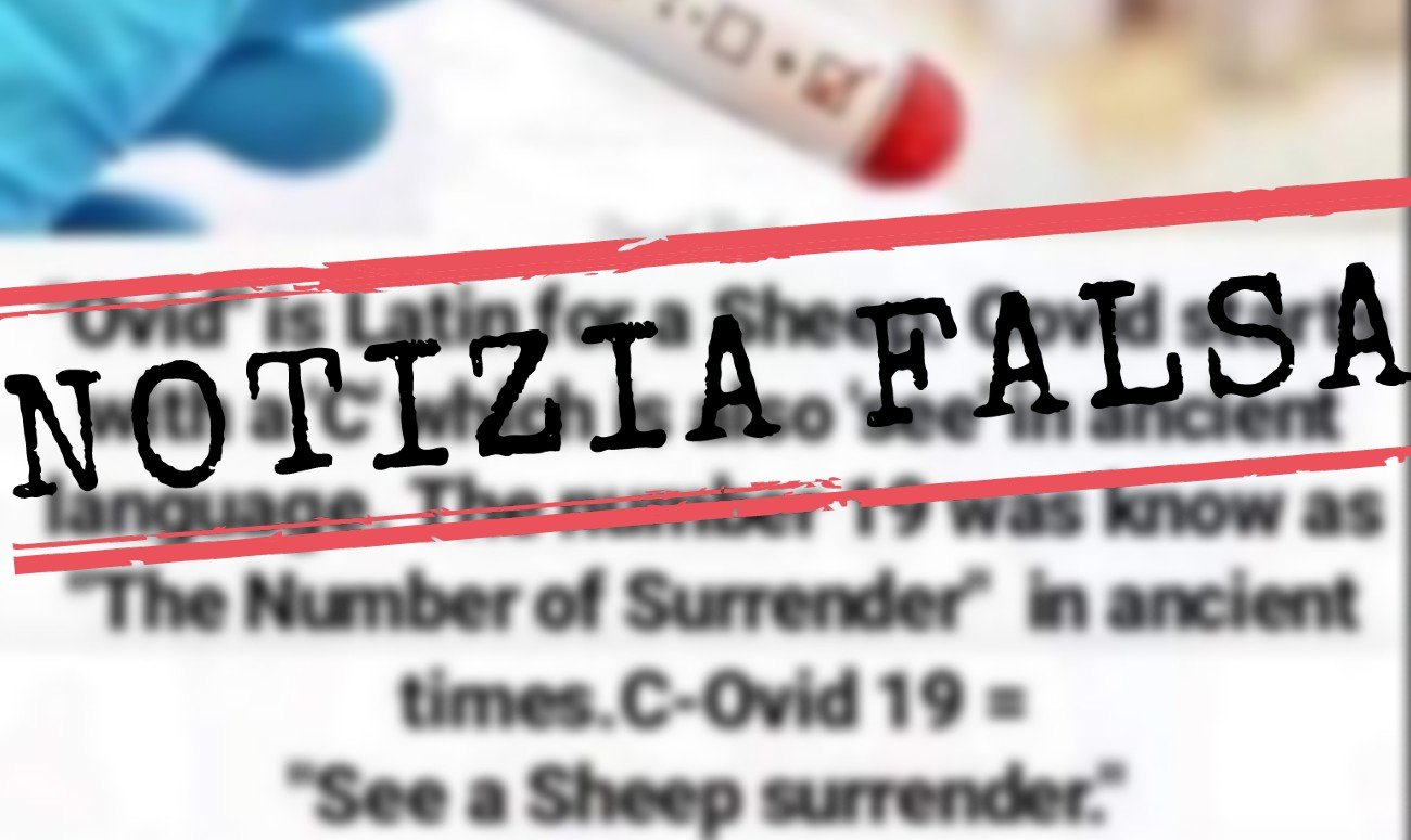 Il 3 luglio su Facebook è stata pubblicata un’immagine che mostra una provetta recante sopra la scritta «COVID-19» sorretta da una mano che veste un guanto azzurro. Nell’immagine è presente un testo in lingua inglese. Si legge: «“Ovid” is Latin for a sheep. COVID starts with a ‘C’, which also means ‘see’ in ancient language. 19 was known as the “number of surrender” in ancient times. C-OVID 19 = “See A Sheep Surrender.”». Tradotto in italiano il risultato sarebbe molto simile a: «”Ovid” in latino significa pecora. COVID inizia con una ‘C’, che significa anche ‘vedere’ in lingua antica. 19 è conosciuto come il numero della resa nell’antichità. C-OVID 19 = “Vedi una pecora arrendersi”»). L’immagine è accompagnata da questo commento, scritto da chi l’ha pubblicata: «La prossima volta il Dipartimento Pandemie dovrà trovare un nome meno ovvio e facile da decifrare!».