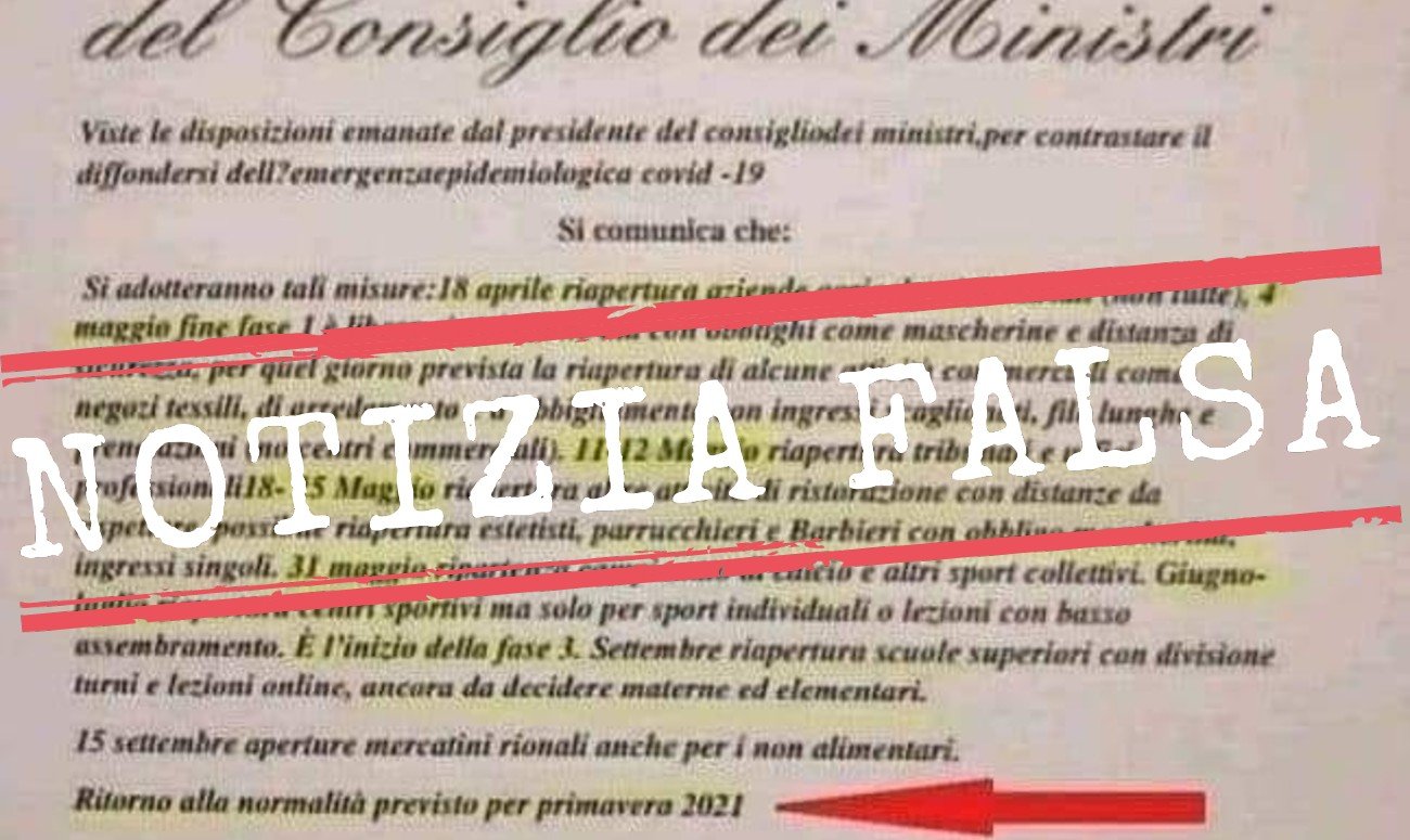 L’11 luglio su Facebook è stata pubblicata un’immagine che mostra un presunto documento stilato dalla Presidenza del Consiglio dei ministri e datato 9 aprile 2020 in cui si legge che il «ritorno alla normalità» in Italia, dopo l’emergenza sanitaria per il nuovo coronavirus e le varie fasi di riaperture delle attività dopo il periodo di lockdown, sarebbe previsto per «primavera 2021». L’immagine è accompagnata da un commento, scritto da chi ha pubblicato il contenuto, in cui si sostiene che il presidente del Consiglio Giuseppe Conte avrebbe mentito sulla data della fine dello “stato di emergenza” che non sarebbe il 31 dicembre.