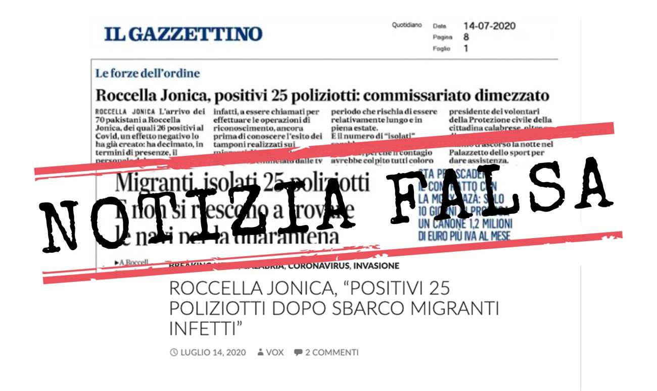 Mercoledì 15 luglio la redazione di Facta ha ricevuto una segnalazione via WhatsApp che chiedeva di verificare le informazioni contenute in un articolo pubblicato il 14 luglio 2020 dal sito web Vox News (finito nella lista di «siti di misinformazione sul Coronavirus» di NewsGuard), dal titolo «Roccella Jonica, “positivi 25 poliziotti dopo sbarco migranti infetti”».