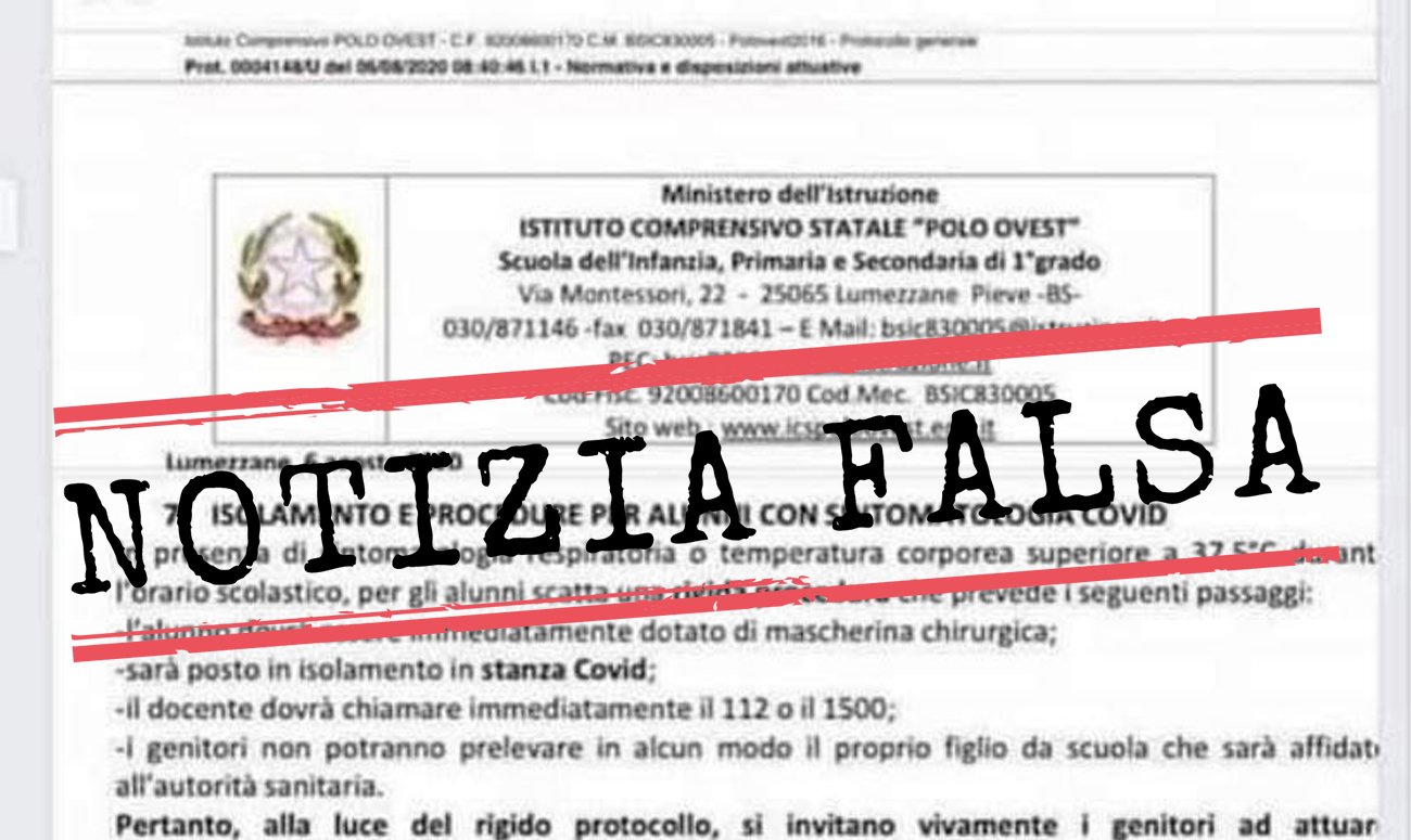 Martedì 18 agosto 2020 la redazione di Facta ha ricevuto una segnalazione via WhatsApp che chiedeva di verificare l’attendibilità di alcune informazioni contenute in un post pubblicato il 17 agosto su Facebook. Il post oggetto della nostra verifica riporta un’immagine, recante il logo della Repubblica Italiana, che mostra la parte testuale di un documento. Il titolo del paragrafo, al punto «7», è: «Isolamento e procedure per alunni con sintomatologia Covid».