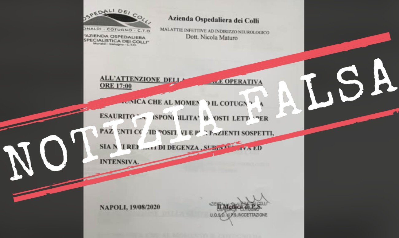 No, l’ospedale Cotugno di Napoli non ha «esaurito la disponibilità di posti letto per pazienti Covid»