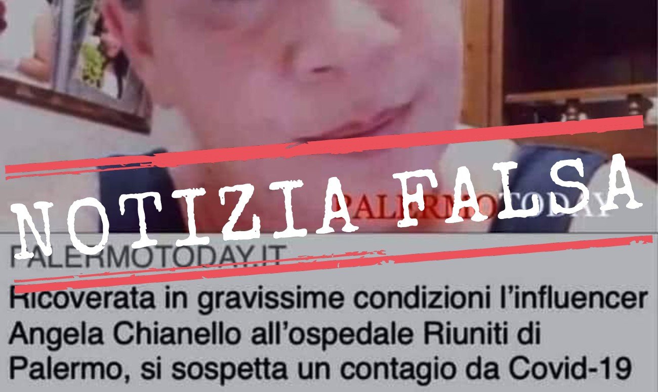 Il 14 settembre 2020 su Facebook è stata pubblicata un’immagine del titolo di un articolo che sarebbe stato pubblicato dalla testata Palermo Today. Si legge: «Ricoverata in gravissime condizioni l’influencer Angela Chianello all’ospedale riuniti di Palermo, si sospetta un contagio da Covid-19». Il riferimento è alla donna protagonista di un video diventato virale dove, intervistata da una troupe televisiva nella spiaggia di Mondello (Sicilia), aveva dichiarato «Non ce n’è Covid. A Palermo non abbiano niente». L’immagine è accompagnata da questo commento: «Il karma…».