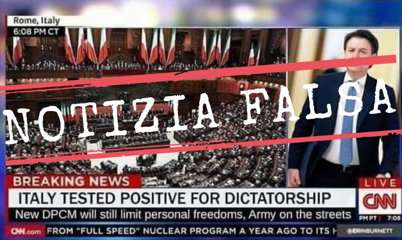 Il 7 ottobre 2020 su Facebook è stato pubblicato il fotogramma di una presunta diretta della Cnn – emittente televisiva statunitense – che mostra una foto dell’aula della Camera dei Deputati e una del presidente del Consiglio Giuseppe Conte. Si legge: «Breaking news: Italy tested positive for dictatorship». L’immagine è accompagnata da questo commento: «Gli italiani è meglio che si sveglino. “L’Italia è risultata positiva alla dittatura”. Lo dice la CNN, rete notoriamente di sinistra».