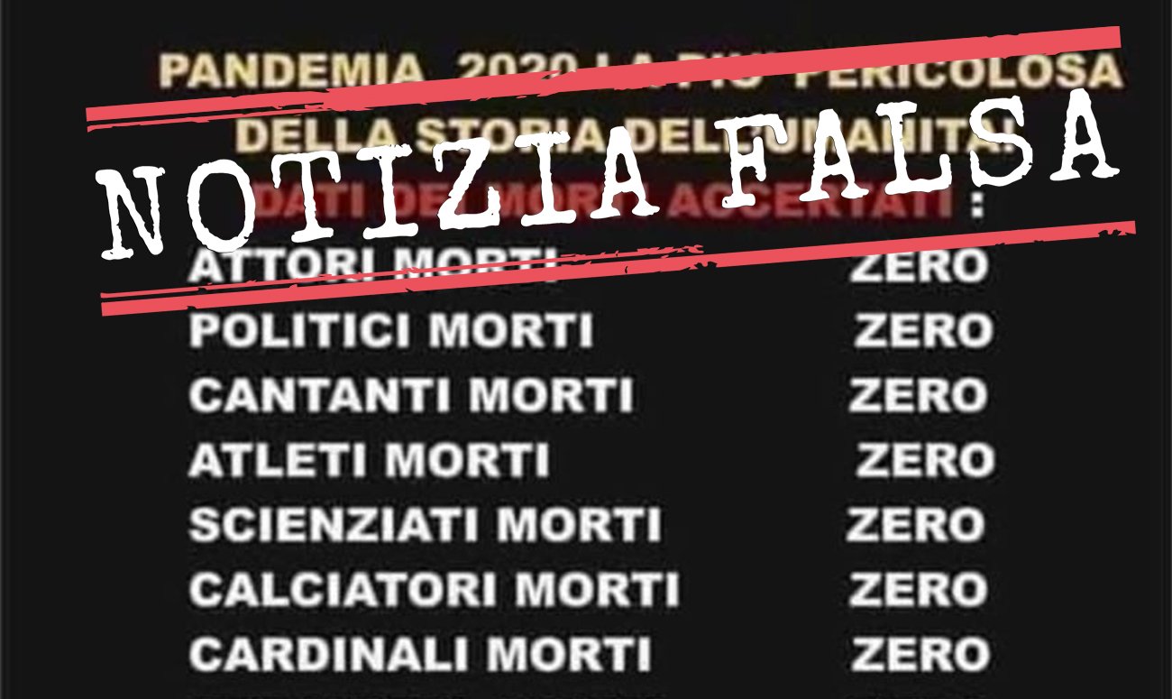 Martedì 13 ottobre 2020 la redazione di Facta ha ricevuto una segnalazione via Facebook che chiedeva di verificare le informazioni contenute in un post pubblicato l’11 ottobre sul social network. Il post oggetto della nostra verifica contiene un’immagine con un testo in cui si legge: «2020 La pandemia più grossa della storia dell’umanità. Attori morti: zero. Politici morti: zero. Cantanti morti: zero. Atleti morti: zero. Scienziati morti: zero. Calciatori morti: zero. Cardinali morti: zero. Stranieri morti: zero. O il virus è intelligente o qualcosa non quadra. Cosa strana, nel frattempo sono scomparsi tutti i morti per infarto, ictus, leucemia, diabete, overdose, alcolismo, trombosi, embolia polmonare, cancro, infezioni ospedaliere, incidenti stradali, suicidi, omicidi. Ma non vi viene da farvi qualche domanda?».