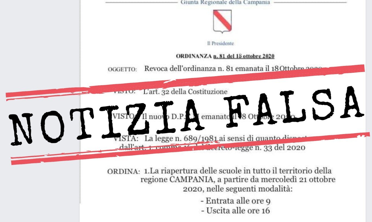 L’ordinanza che prevede dal 21 ottobre la riapertura delle scuole in Campania è falsa