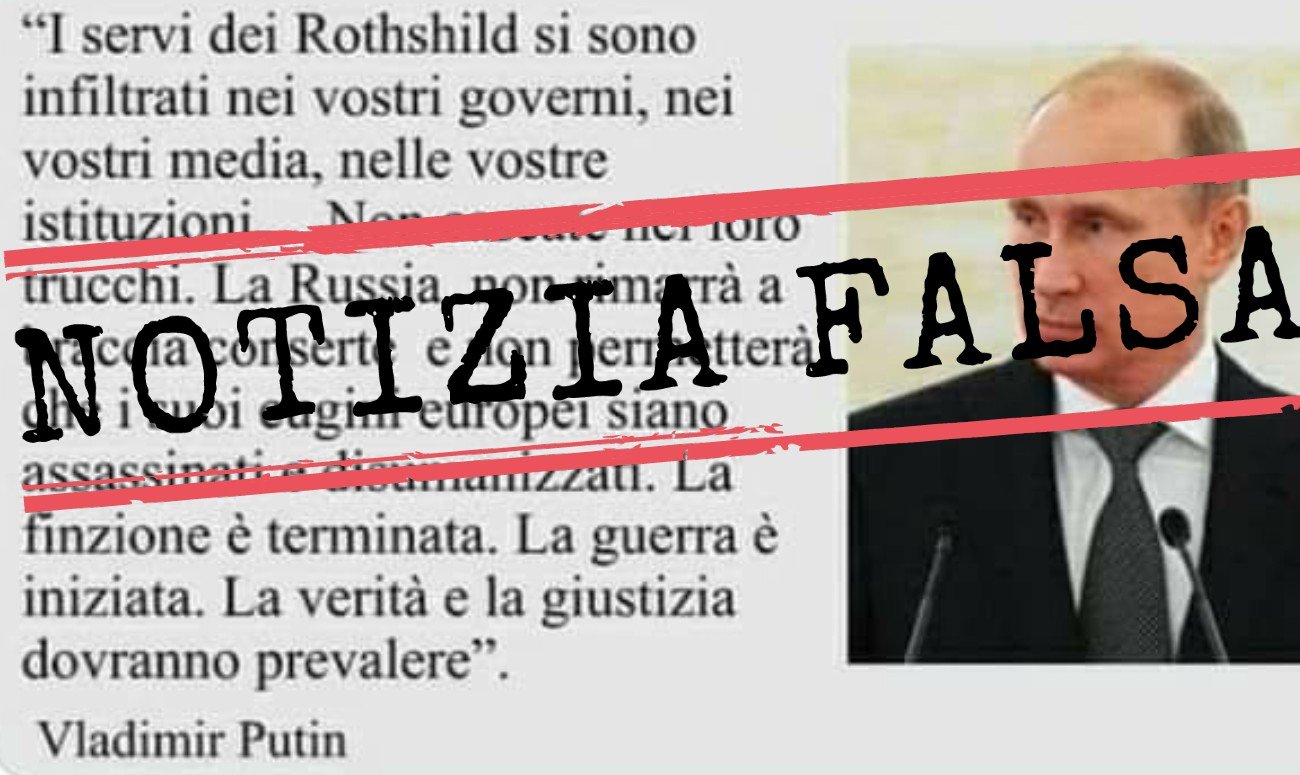 Il 2 novembre 2020 su Facebook è stata pubblicata un’immagine contenente una presunta dichiarazione che avrebbe rilasciato il presidente della Federazione russa, Vladimir Putin: «I servi dei Rothshild [sic] si sono infiltrati nei vostri governi, nei vostri media, nelle vostre istituzioni… Non cascate nei loro trucchi. La Russia non rimarrà a braccia conserte e non permetterà che i suoi cugini europei siano assassinati e disumanizzati. La finzione è terminata. La guerra è iniziata. La verità e la giustizia dovranno prevalere».