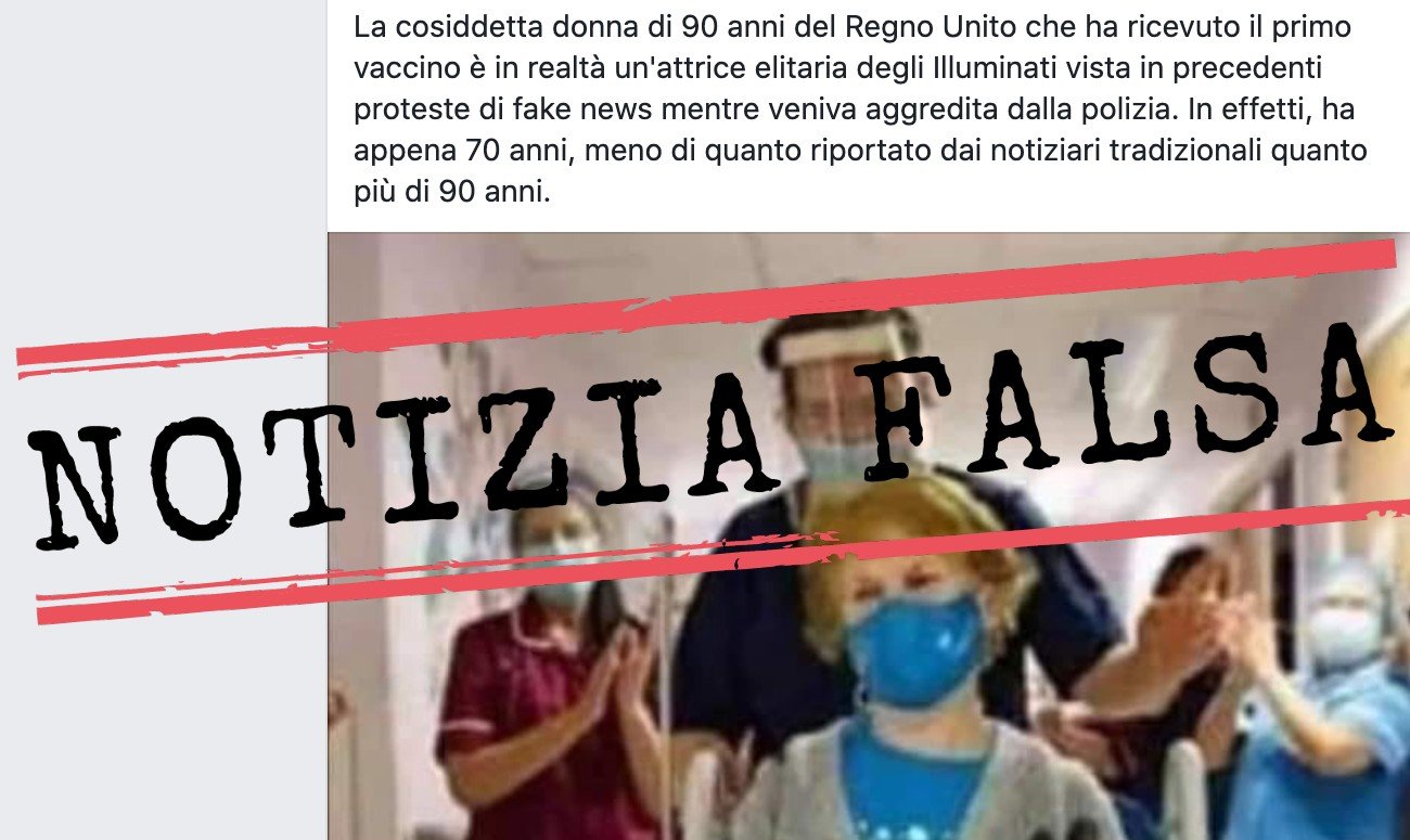 Lo scatto è accompagnato da questo commento, scritto da chi ha pubblicato il post su Facebook: «La cosiddetta donna di 90 anni del Regno Unito che ha ricevuto il primo vaccino è in realtà un’attrice elitaria degli Illuminati vista in precedenti proteste di fake news mentre veniva aggredita dalla polizia. In effetti, ha appena 70 anni, meno di quanto riportato dai notiziari tradizionali quanto più di 90 anni».