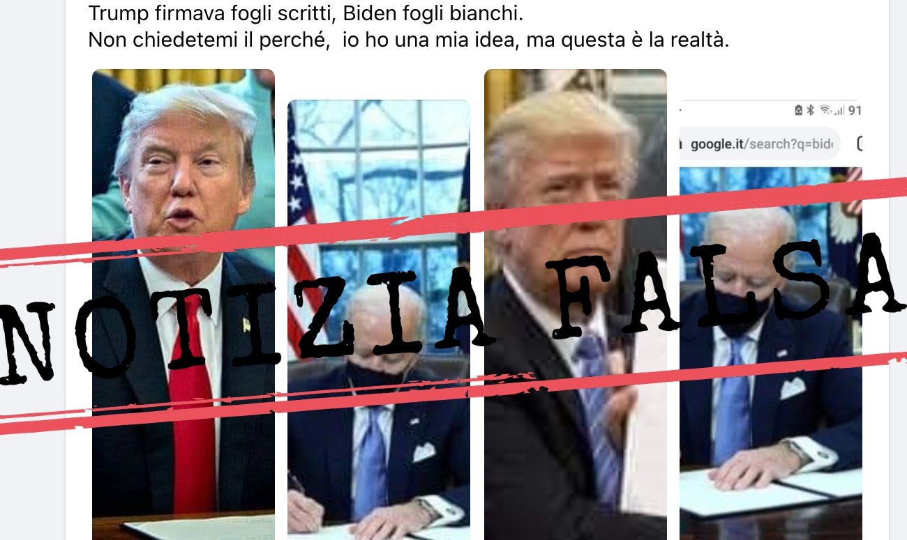 Il 24 gennaio 2021 su Facebook sono state pubblicate quattro foto. Due scatti mostrano l’ex presidente degli Stati Uniti d’America, Donald Trump, prima e dopo aver firmato un ordine esecutivo. Le altre due foto mostrano invece l’attuale presidente degli Stati Uniti d’America, Joe Biden, che sembra firmare degli ordini esecutivi riportati su dei fogli bianchi, dove non non ci sarebbe scritto nulla. Le quattro immagini sono accompagnate da questo commento, scritto da chi ha pubblicato il post su Facebook: «Non voglio avanzare alcuna teoria, ma questa è la realtà davanti ai nostri occhi. Trump firmava fogli scritti, Biden fogli bianchi. Non chiedetemi il perché, io ho una mia idea, ma questa è la realtà».