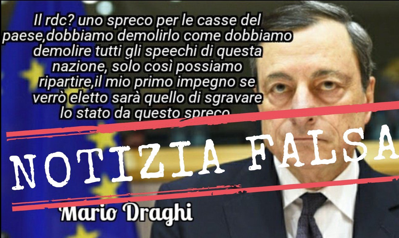 Il 5 febbraio 2021 su Facebook è stata pubblicata una foto del presidente del Consiglio incaricato (con riserva) Mario Draghi accompagnata da una sua presunta dichiarazione. Si legge: «Il rdc? Uno spreco per le casse del paese, dobbiamo demolirlo come dobbiamo demolire tutti gli speechi [errore di battitura presente nel testo della foto, ndr] di questa nazione, solo così possiamo ripartire, il mio primo impegno se verrò eletto sarà quello di sgravare lo stato da questo spreco». Il riferimento è al reddito di cittadinanza, misura voluta dal Movimento 5 Stelle e introdotta nel 2019 durante il governo Conte I.