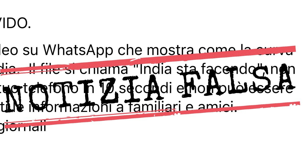 Il 24 febbraio 2021 alla redazione di Facta è arrivata la richiesta di verificare questo messaggio che circola sull’app di messaggistica WhatsApp: «Inizieranno a far circolare un video su WhatsApp che mostra come la curva Covid19 si stia appiattendo in India. Il file si chiama “India sta facendo”, non aprirlo e non vederlo, hackera il tuo telefono in 10 secondi e non può essere fermato in alcun modo.Trasmetti le informazioni a familiari e amici. Ora l’hanno detto anche ai telegiornali».