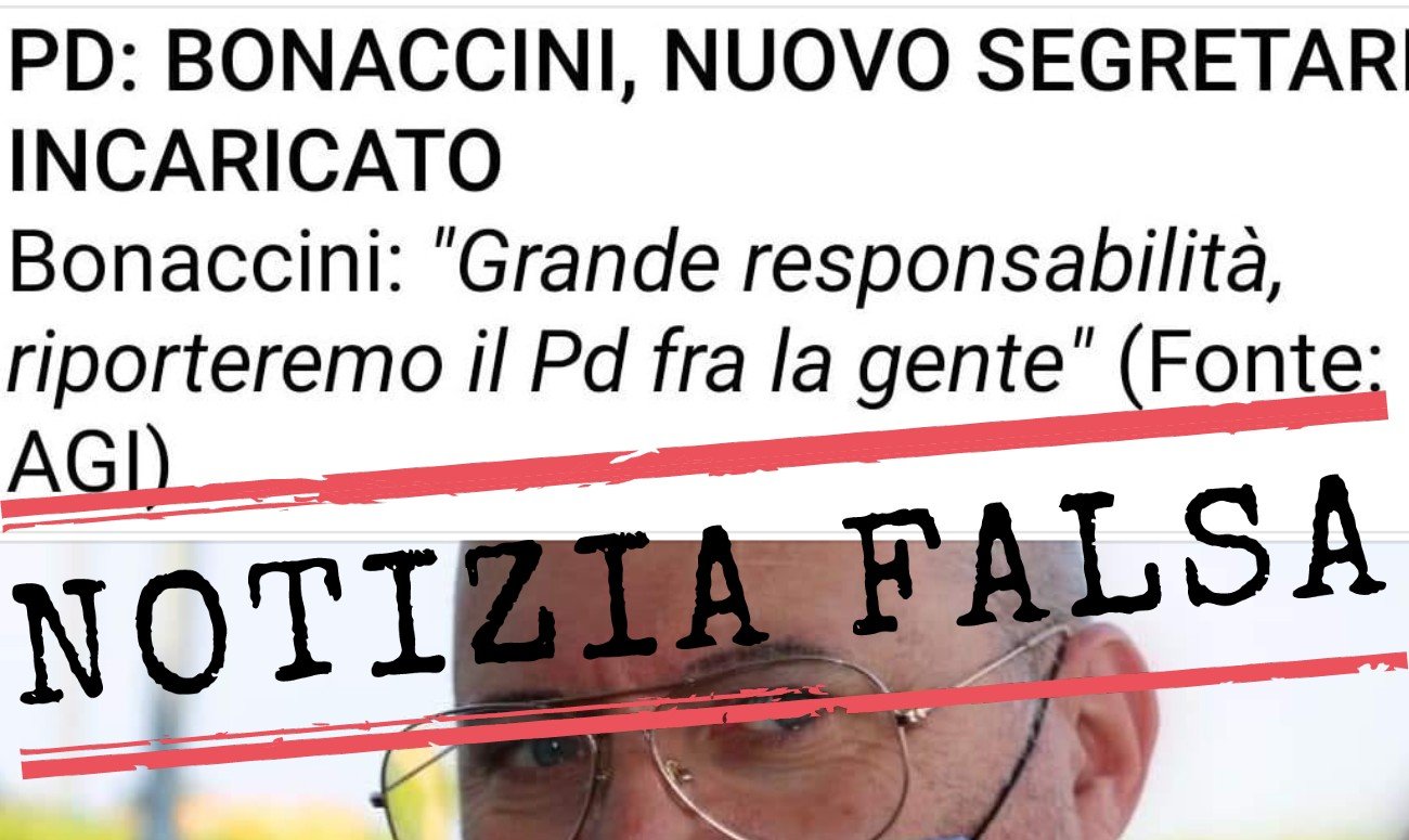 Il 4 marzo 2021 su Facebook è stata postata un’immagine che mostra una presunta notizia pubblicata dall’agenzia di stampa Agi secondo cui Stefano Bonaccini, presidente della regione dell’Emilia Romagna, sarebbe il nuovo segretario incaricato del Partito democratico. Lo stesso giorno, il governatore del Lazio Nicola Zingaretti ha annunciato le proprie dimissioni dalla carica di segretario nazionale del Pd.