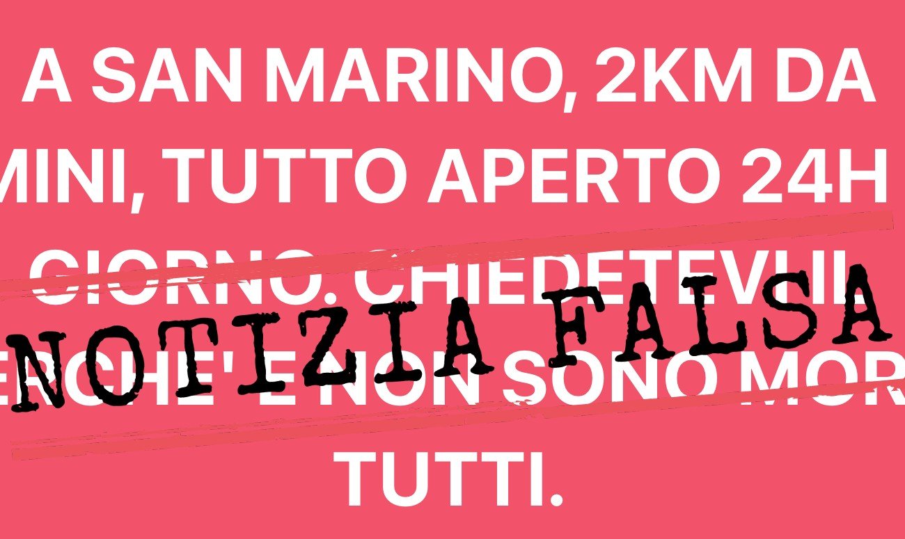 Il 4 marzo 2021 su Facebook è stato pubblicato un post in cui si legge che a «San Marino, 2km da Rimini» sarebbe «tutto aperto 24h al giorno» e che invita gli utenti a chiedersi «il perché» precisando che non tutti gli abitanti «sono morti» a causa della Covid-19. Il riferimento è alle misure restrittive imposte sul territorio italiano per limitare la diffusione del nuovo coronavirus nel Paese.
