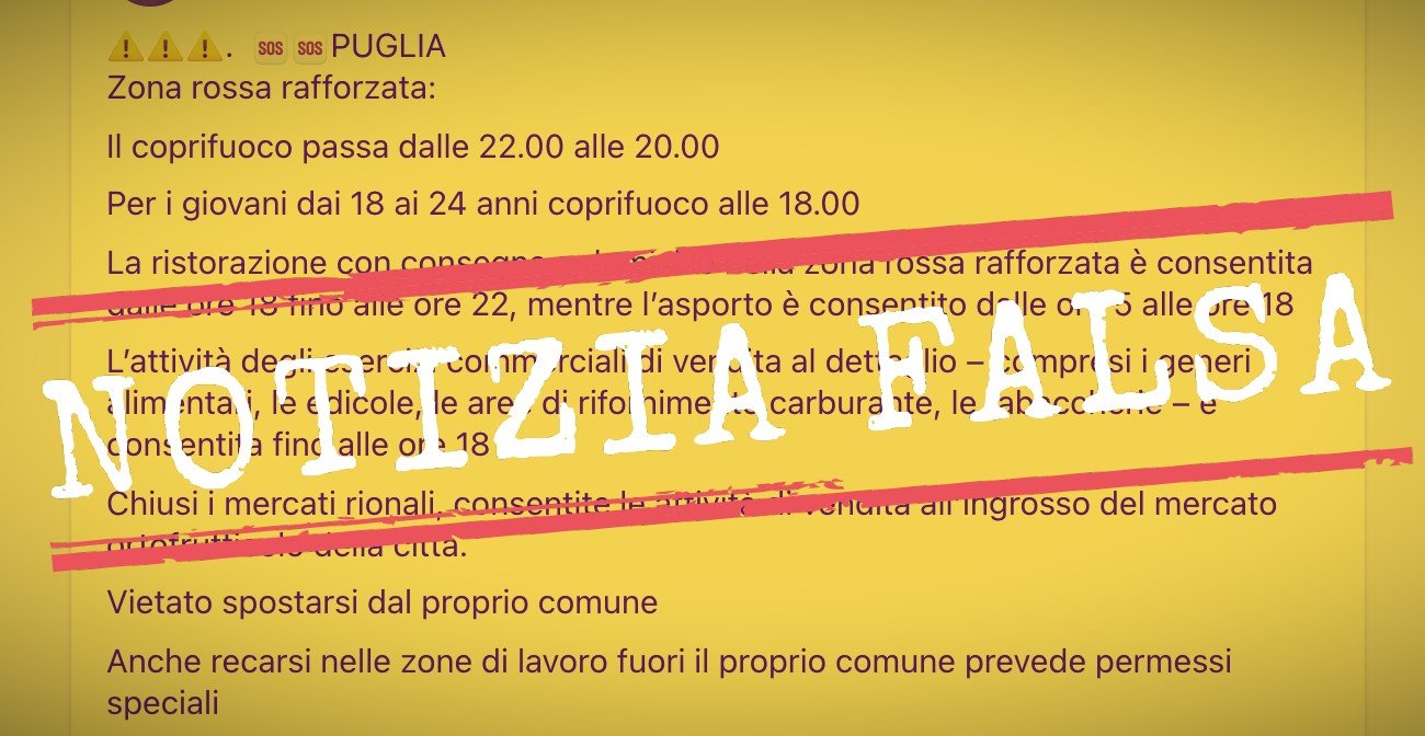 Il 21 marzo 2021 su Facebook è stato pubblicato un post in cui si legge che in Puglia sarebbe stata attivata la zona rossa rafforzata che prevede, tra le varie misure, che «il coprifuoco» passi dalle 22.00 alle 20.00 e che «per i giovani dai 18 ai 24 anni» scatti alle 18.00.