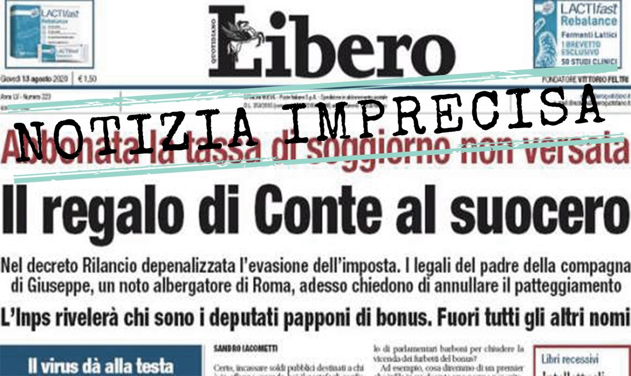 Giovedì 13 agosto 2020 la redazione di Facta ha ricevuto una segnalazione via WhatsApp che chiedeva di verificare le informazioni, contenute nella prima pagina di Libero del 13 agosto 2020, secondo cui il presidente del Consiglio Giuseppe Conte avrebbe abbuonato «la tassa di soggiorno non pagata» dal suocero, l’imprenditore alberghiero Cesare Paladino.
