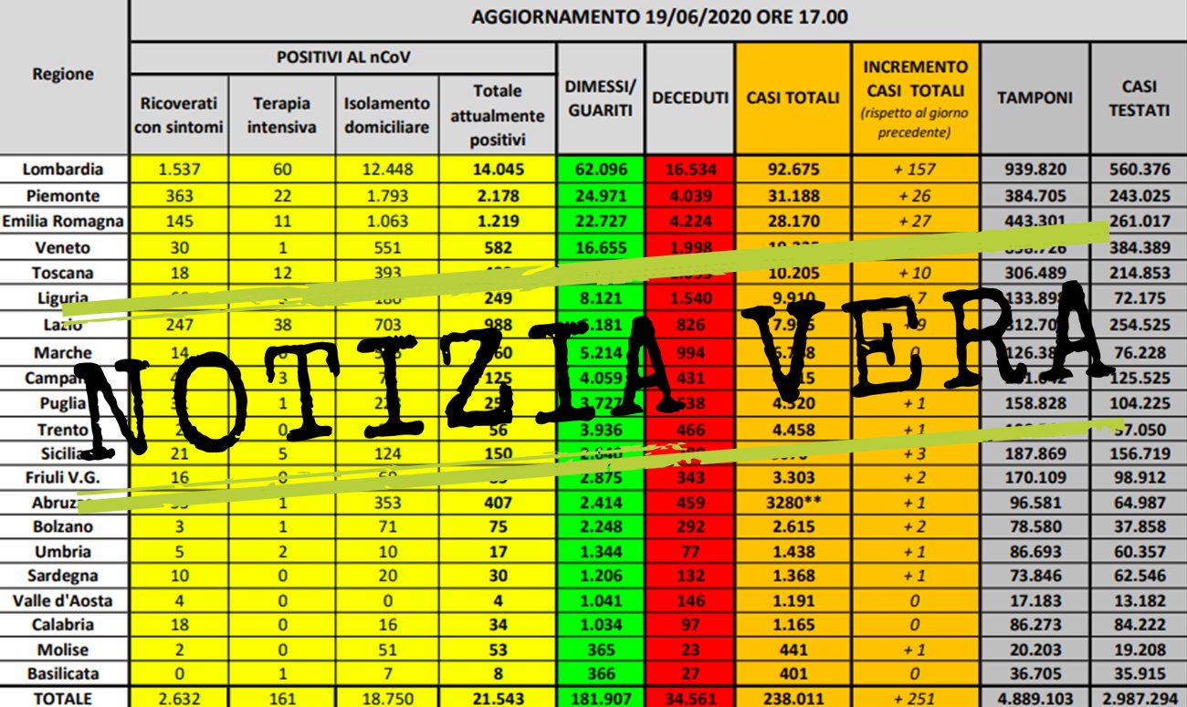 Secondo il monitoraggio giornaliero sull’emergenza sanitaria, effettuato dalla Protezione Civile e pubblicato sul sito del ministero della Salute, i casi totali di Covid-19 in Italia erano 238.159 il 18 giugno 2020, mentre il giorno successivo, il 19 giugno, erano scesi a 238.011.