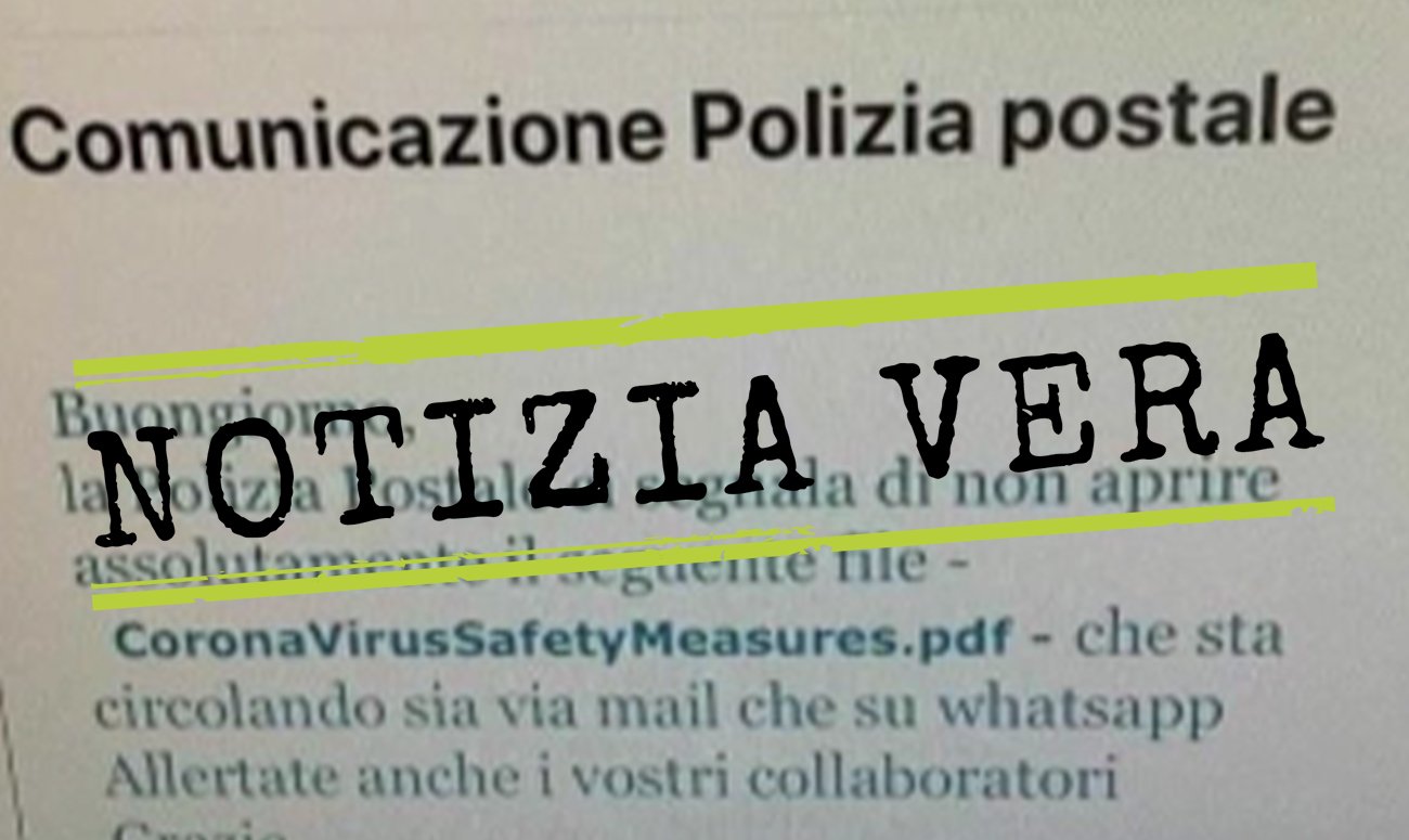 L’immagine contiene un testo che recita: «Buongiorno, la Polizia Postale ci segnala di non aprire assolutamente il seguente file – CoronaVirusSafetyMeasures.pdf – che sta circolando sia via mail che su WhatsApp. Allertate anche i vostri collaboratori, grazie».