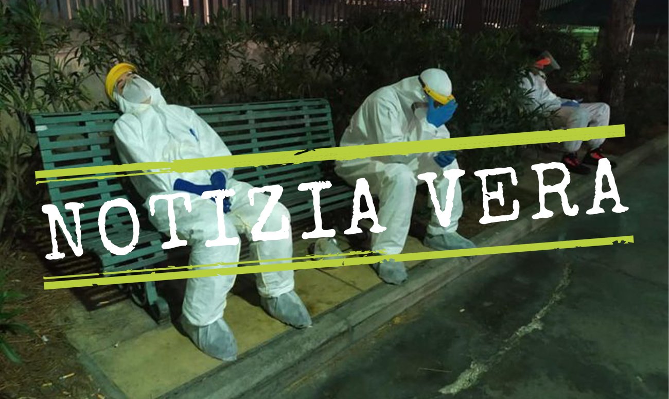Lunedì 26 ottobre 2020 la redazione di Facta ha ricevuto una segnalazione via WhatsApp che chiedeva di verificare l’autenticità di una fotografia circolata su Facebook. La fotografia oggetto della nostra verifica ritrae tre persone, vestite con tuta bianca monouso, guanti blu e visiera in plexiglass, sedute su una panchina e visibilmente stanche. L’immagine è stata pubblicata da numerosi mezzi d’informazione (ad esempio qui, qui e qui), che l’hanno presentata come la foto di «soccorritori del 118 allo stremo».
