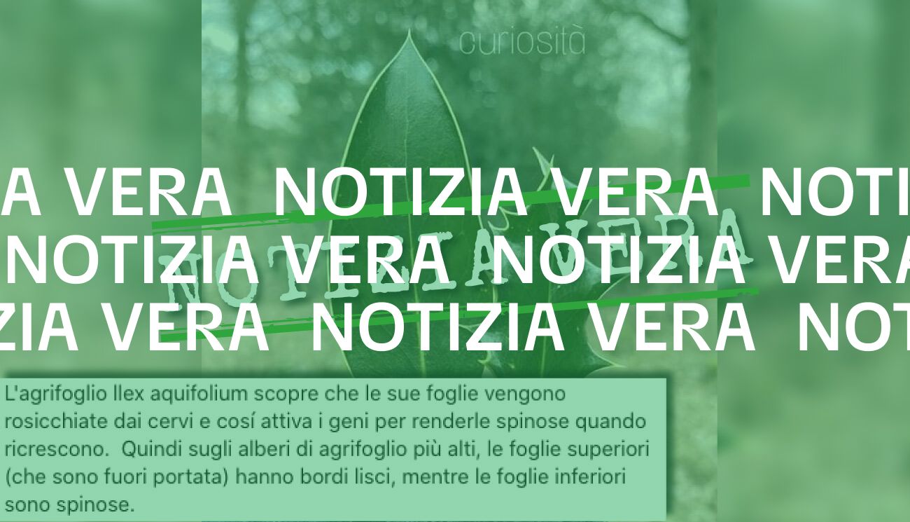 Il 13 gennaio 2024 la redazione di Facta ha ricevuto una segnalazione via WhatsApp che chiedeva di pubblicare un post pubblicato 4 giorni prima su Facebook secondo cui l’agrifoglio ilex «attiva i geni» per rendere le proprie foglie «spinose quando ricrescono» perché altrimenti vengono rosicchiate dai cervi. Sugli alberi di agrifoglio più alti, si legge ancora, «le foglie superiori (che sono fuori portata) hanno bordi lisci, mentre le foglie inferiori sono spinose».