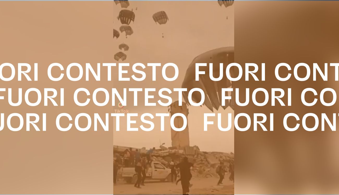 Il filmato è stato registrato il 25 marzo 2024 e mostra il momento in cui gli aiuti umanitari, lanciati dagli Stati Uniti tramite aerei nel nord della Striscia di Gaza, sottoposta anche allora al blocco israeliano, stanno per toccare terra. La stessa scena è stata ripresa infatti da altre angolazioni catturate da video e foto pubblicate da diversi media internazionali che all’epoca riportarono la notizia.