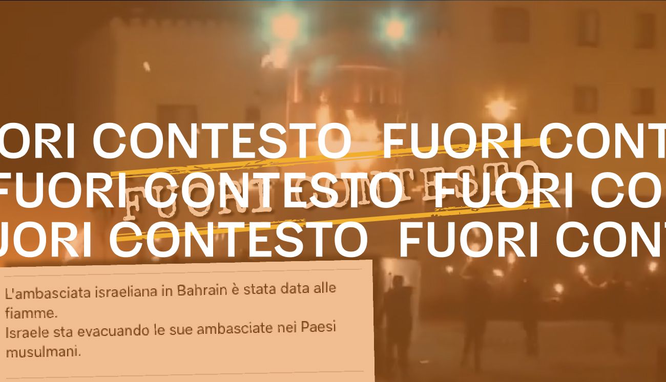 Il 19 ottobre 2023 è stato pubblicato su Facebook il video di alcune persone che di notte lanciano quelle che sembrano bottiglie molotov contro un edificio, che prende poi fuoco. Il filmato è accompagnato da un commento, scritto dall’autore del post, che recita: «L’ambasciata israeliana in Bahrain è stata data alle fiamme». Lo stesso contenuto è stato pubblicato anche su TikTok.