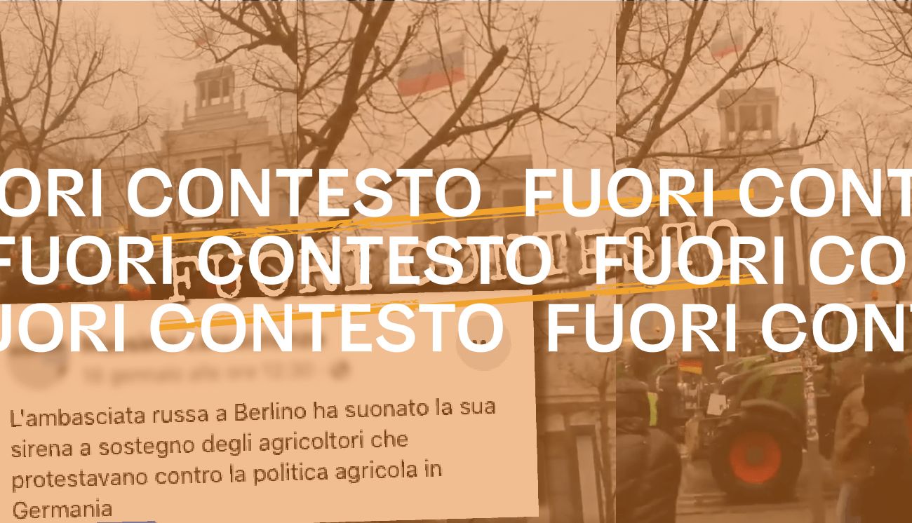L’edificio che si vede nel video è realmente la sede dell’ambasciata russa a Berlino. Non esiste tuttavia alcun riscontro sui media tedeschi di un presunto sostegno dell’ambasciata russa alle proteste degli agricoltori a gennaio 2024. Inoltre, contattata dai fact-checker tedeschi di Correctiv, la stessa ambasciata russa a Berlino ha smentito la notizia, affermando che l’informazione diffusasi sui social secondo cui «l’ambasciata della Federazione Russa in Germania ha attivato ‘una sirena’ per ‘solidarietà’ alle manifestazioni del 15 gennaio 2024 a Berlino» non corrisponde alla realtà. L’ambasciata, ha precisato ancora nella sua risposta, di non prendere parte a manifestazioni civili.