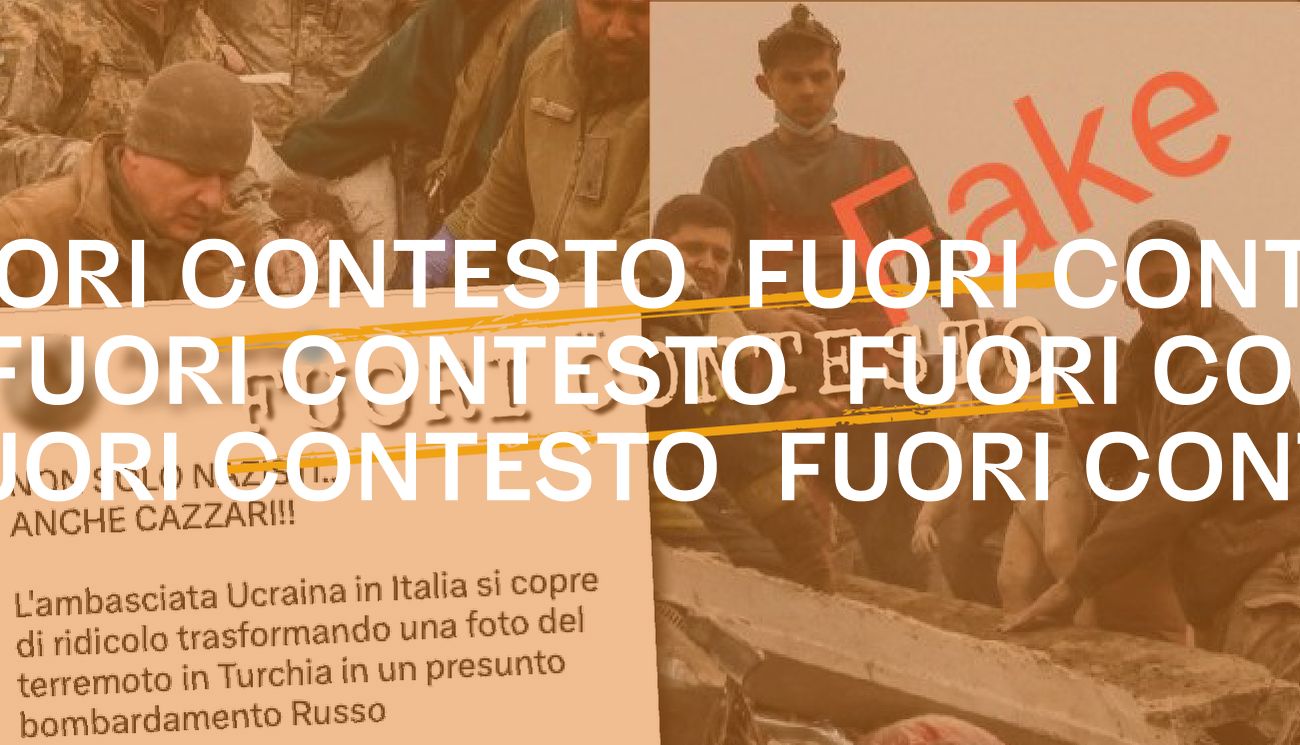Chi ha condiviso lo screenshot afferma, tuttavia, che una delle due immagini non ritrarrebbe i danni di un «presunto bombardamento russo». Si tratterebbe in realtà di «una foto del terremoto in Turchia». Sulla foto che sarebbe stata utilizzata dall’ambasciata ucraina con la falsa localizzazione compare la scritta «Fake» (in italiano, «Falso»).