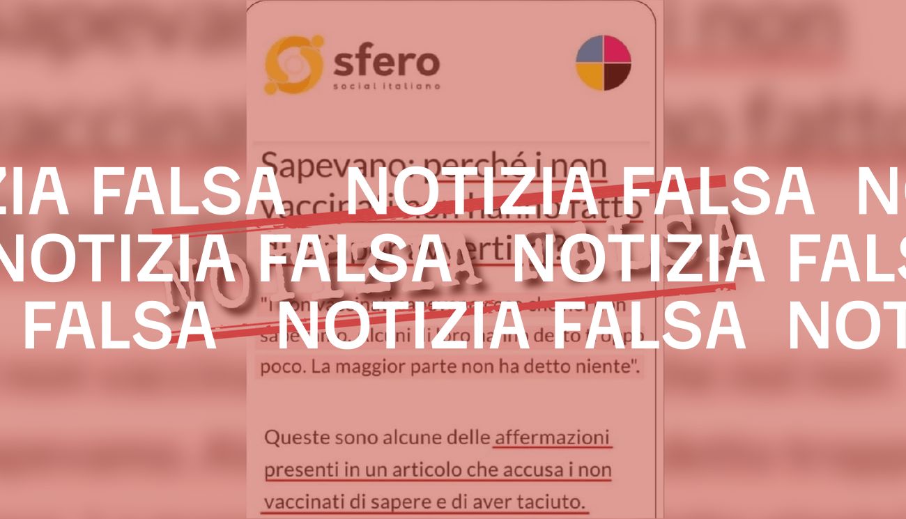 Il 14 marzo 2023 la redazione di Facta.news ha ricevuto una segnalazione via WhatsApp che chiedeva di verificare uno screenshot pubblicato su Facebook. Nell’immagine, che mostra un contenuto che appare come diffuso sul social network italiano Sfero, si trova un testo che recita: «Perché i non vaccinati non hanno fatto di più per avvertirci? “I non vaccinati sapevano cose che noi non sapevamo. Alcuni di loro hanno detto troppo poco. La maggior parte non ha detto niente”».