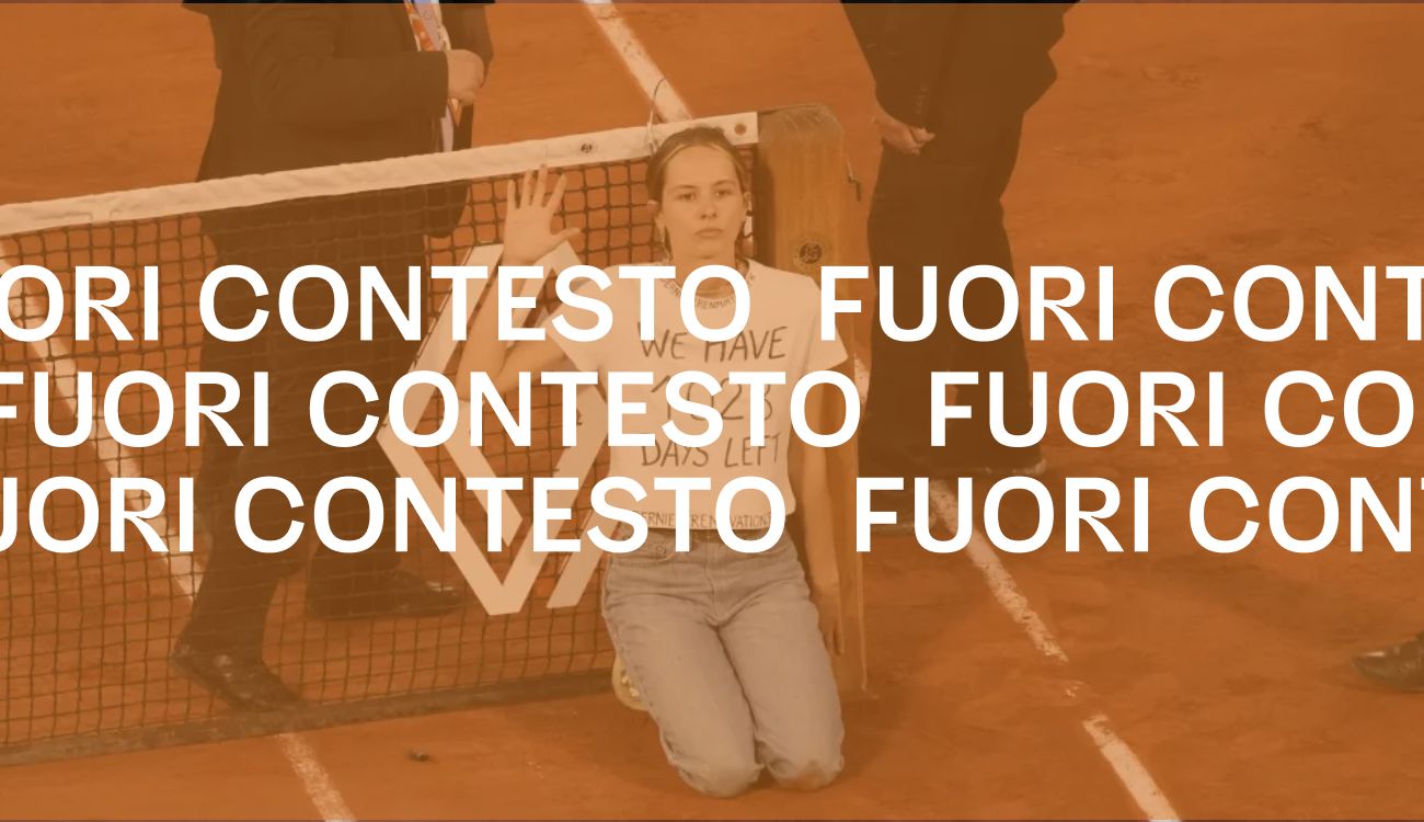 La scena risale al 3 giugno 2022, quando allo stadio Roland Garros di Parigi, in Francia, un’attivista climatica francese del movimento Dernière Rénovation era entrata in campo interrompendo la semifinale del torneo di tennis Open di Francia, disputata tra Marin Cilic e Casper Ruud. L’attivista si era legata all’estremo della rete del campo da tennis per poi mettersi in ginocchio e mostrare la maglia bianca che indossava con scritto, in inglese, «ci rimangono 1028 giorni»; dopo 15 minuti l’attivista era stata portata via dagli agenti della sicurezza ed era stata trattenuta dalla polizia per 40 ore.