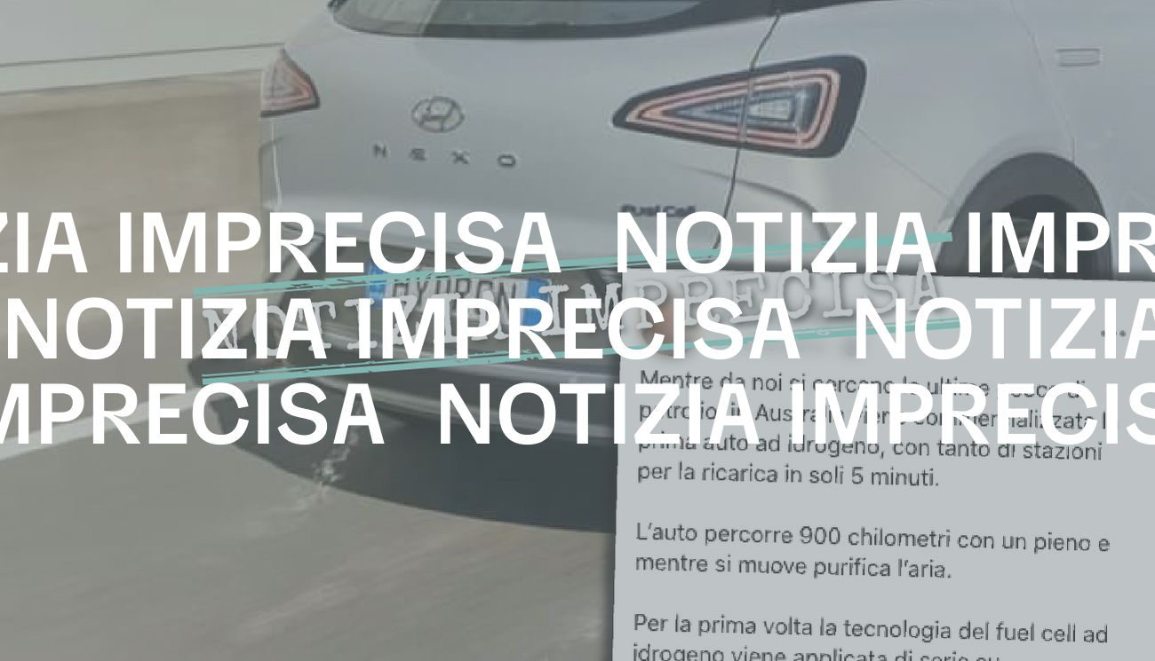Il 21 dicembre 2023 la redazione di Facta ha ricevuto una segnalazione via WhatsApp che chiedeva di verificare un post pubblicato il 5 settembre 2023 su Facebook secondo cui «in Australia viene commercializzata la prima auto ad idrogeno». Nel contenuto social si legge che si tratterebbe della «Hyundai Nexo un auto di piccola cilindrata» che «percorre 900 chilometri con un pieno», «mentre si muove purifica l’aria» e «si ricarica in soli 5 minuti».