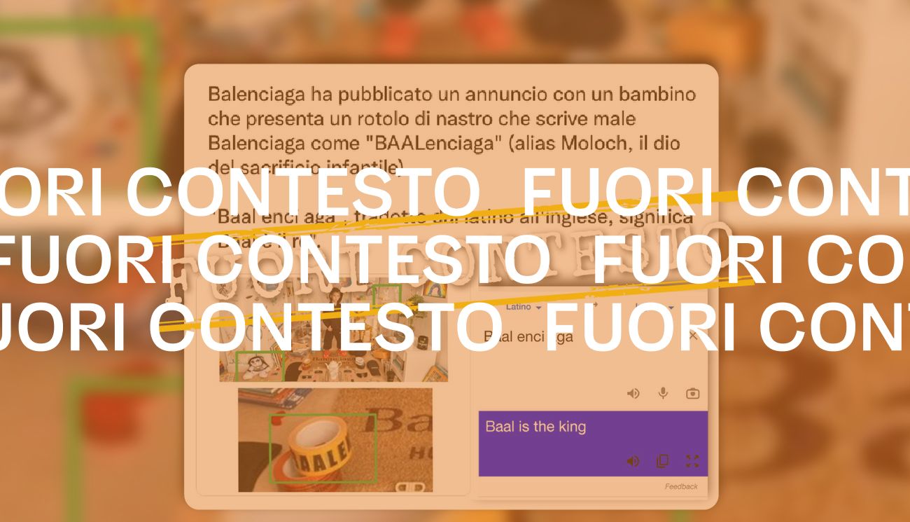 L’immagine contenuta nel tweet oggetto della nostra analisi è reale ed è uno degli scatti ritirati da Balenciaga. Secondo l’autore del post, il nastro presente nella foto farebbe riferimento a Baal (talvolta chiamato Bael), dio della fertilità fenicio menzionato nell’Antico Testamento e inserito nella gerarchia dei demoni cristiani da alcuni teologi ed esorcisti. Inserendo le parole “baal enci aga” su Google Translate e traducendole dal latino all’italiano, il servizio restituisce effettivamente la frase “baal è il re”, ma si tratta di un errore.