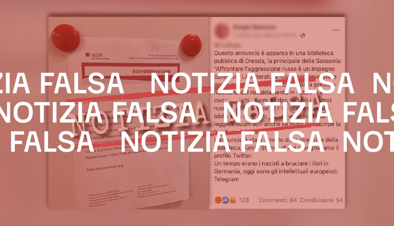 La foto è accompagnata da un commento in italiano, scritto da chi ha pubblicato il post, in cui si afferma che l’annuncio sarebbe «apparso in una biblioteca pubblica di Dresda», e che ci sarebbe scritto che «la letteratura russa non deve avere posto nella tua libreria. A causa della prevista riduzione del riscaldamento in autunno e in inverno, ti chiediamo di donare libri di autori russi da utilizzare per il riscaldamento della biblioteca». Sempre secondo il post oggetto di analisi, l’annuncio sarebbe stato firmato «dalla direttrice della biblioteca, Katrin Stump».