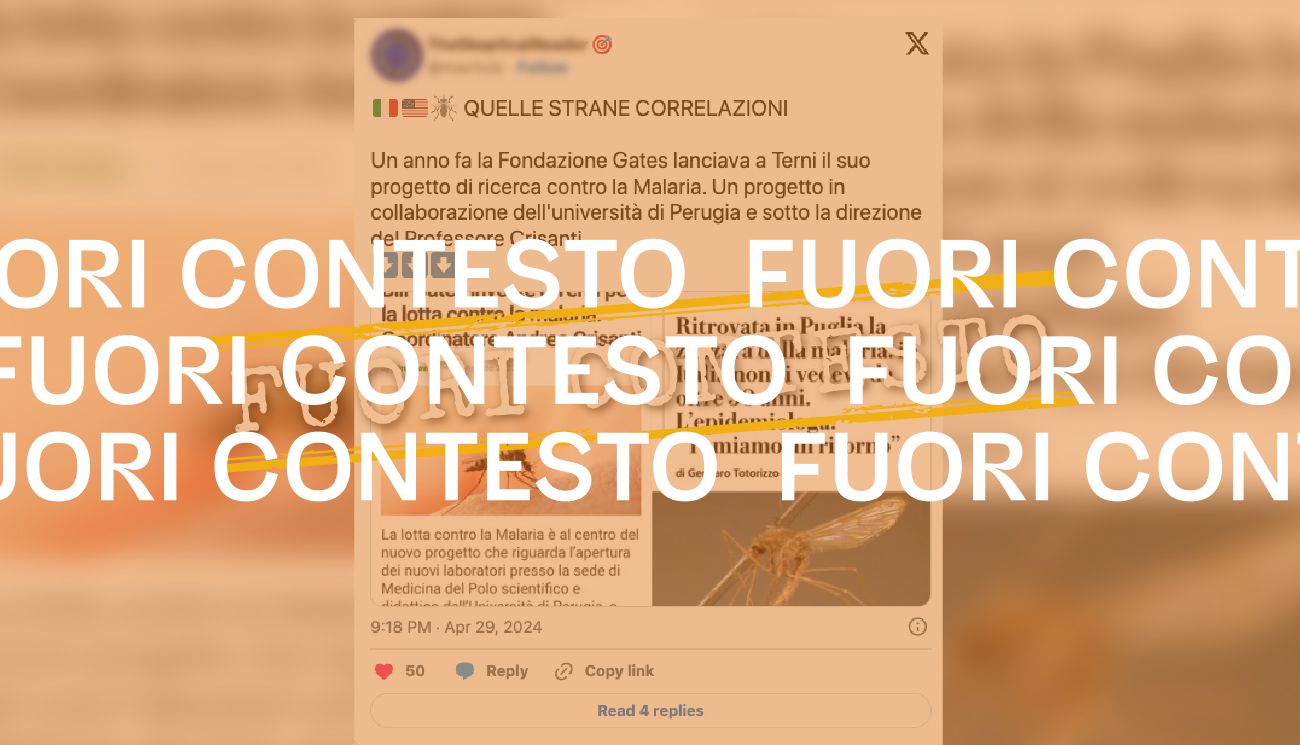Il 29 aprile 2024 è stato pubblicato su X un post che riporta gli screenshot di due articoli. Il primo, pubblicato l’8 agosto 2023 sul sito Ambientebio, è intitolato: “Bill Gates investe a Terni per la lotta contro la malaria. Coordinatore Andrea Crisanti”; il secondo, apparso su La Repubblica il 27 aprile 2024, è intitolato: “Ritrovata in Puglia la zanzara della malaria: in Italia non si vedeva da oltre 50 anni. L’epidemiologa: «Temiamo un ritorno»”.