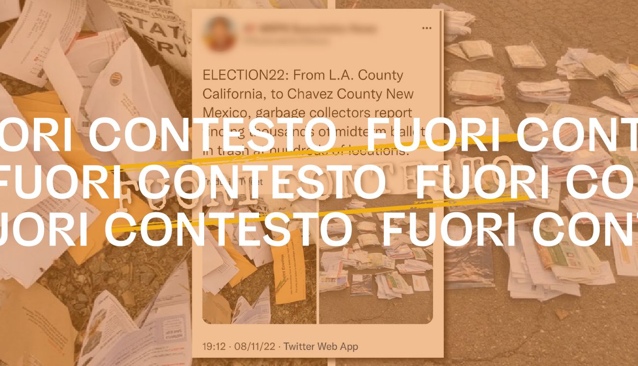 L’immagine è accompagnata da un commento in italiano che recita: «Da L.A. Contea della California, alla contea di Chavez nel Nuovo Messico, riferiscono di aver trovato migliaia di schede nella spazzatura in centinaia di località. #Midterms2022 #Midterm».