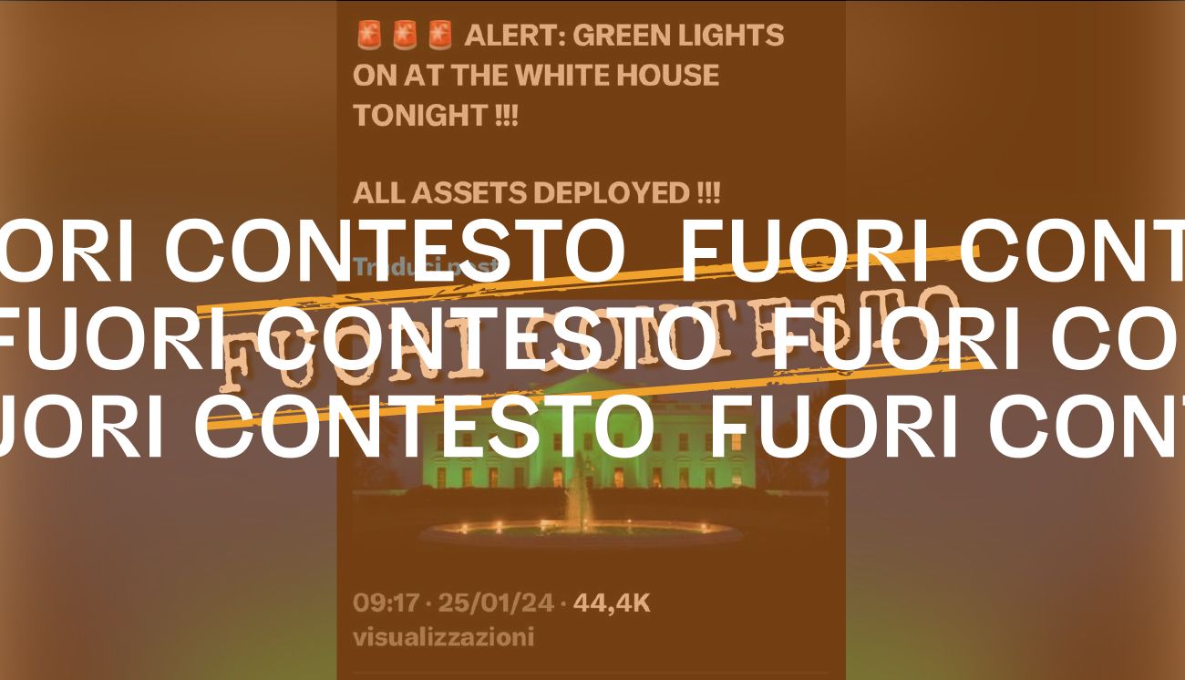 Il 25 gennaio 2024 è stato pubblicato su Facebook lo screenshot di un post pubblicato lo stesso giorno su X dall’account «@QTHESTORMM». Nel tweet compare una foto della Casa Bianca illuminata di verde e il testo in inglese «ALERT: green lights on at the White House tonight !!! ALL ASSETS DEPLOYED» (in italiano, «Alert: stasera luci verdi alla Casa Bianca!!! Tutte le risorse impiegate»). L’immagine è accompagnata da un commento, scritto dall’autore del post su Facebook, che contiene la traduzione in italiano del tweet.